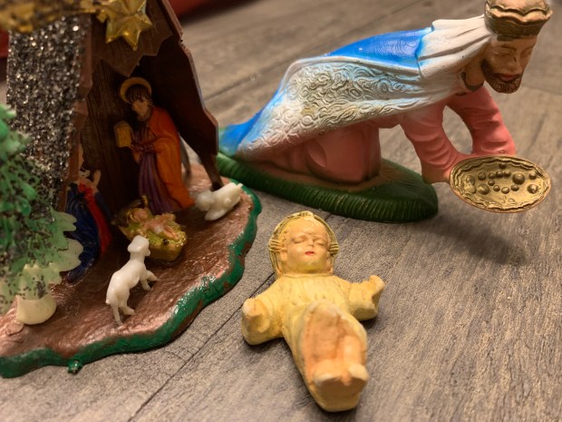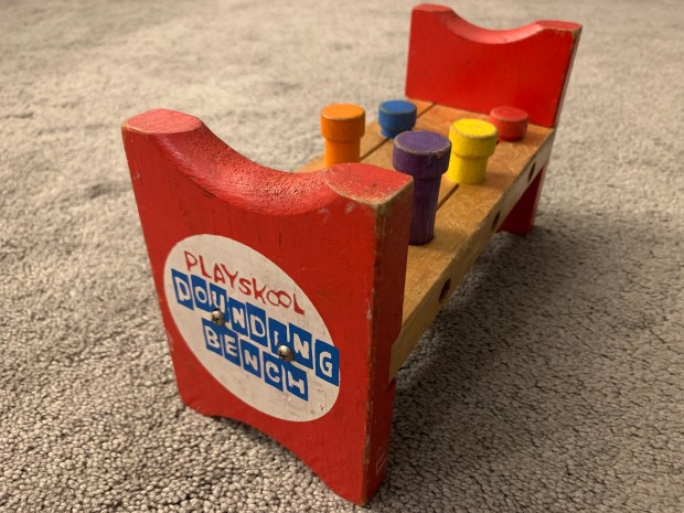 Toys!  Above a Playskool “Pounding Bench” and below a vintage Gerber baby doll.