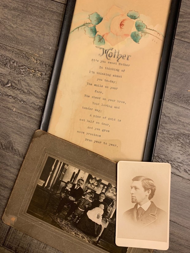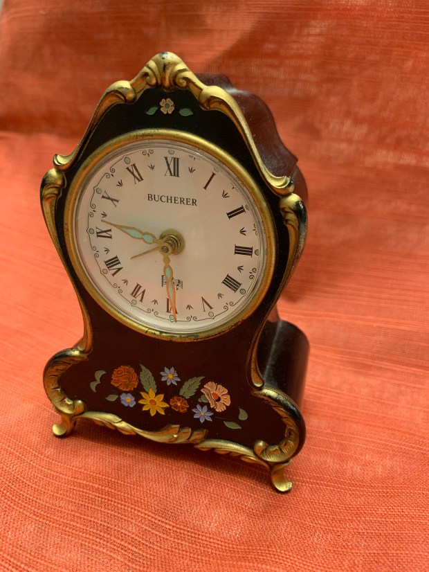 Above a vintage alarm clock with a music box that plays Edelweiss (circa 1940s-60s). Below a sweet poem and some vintage photographs.