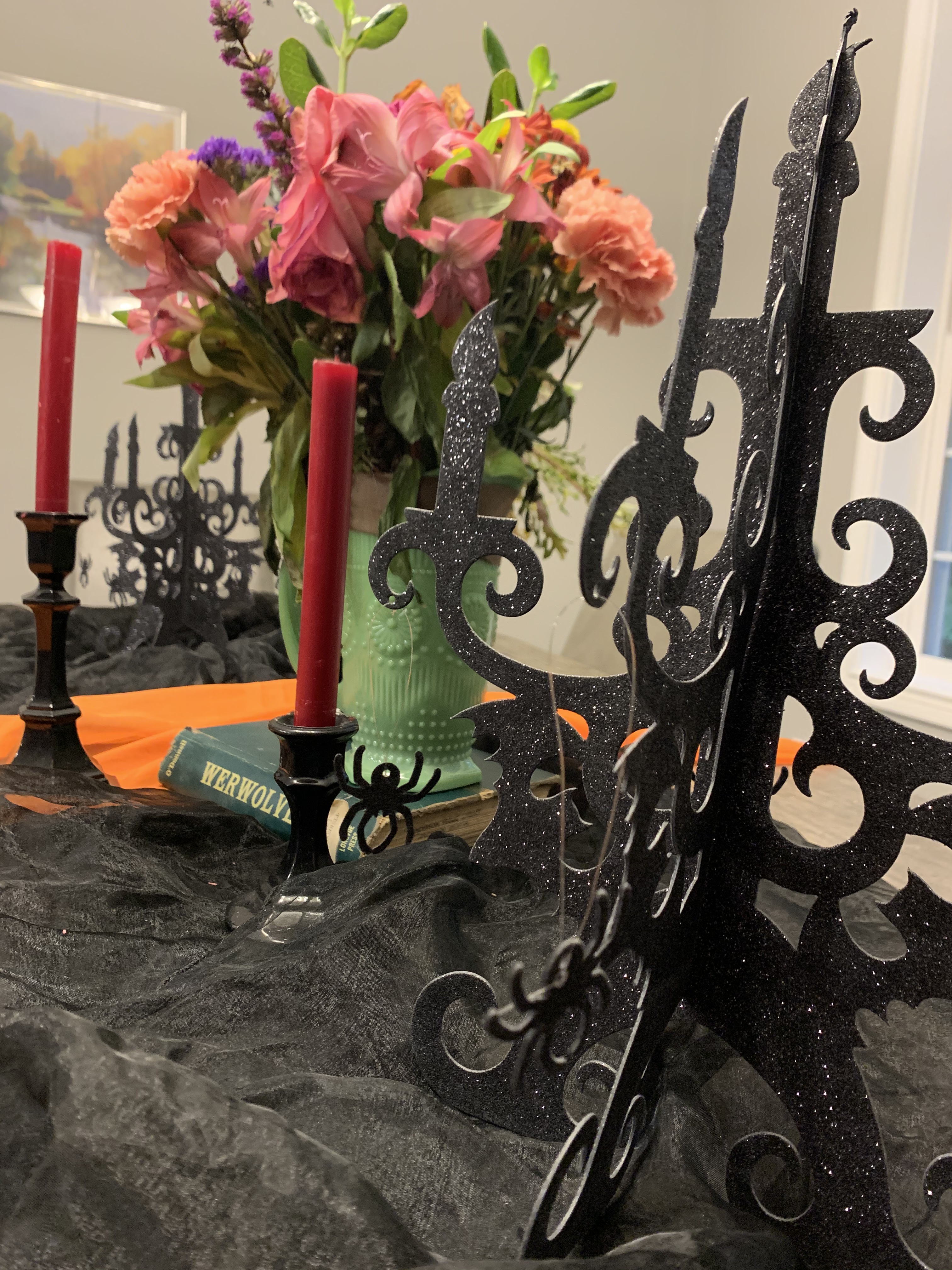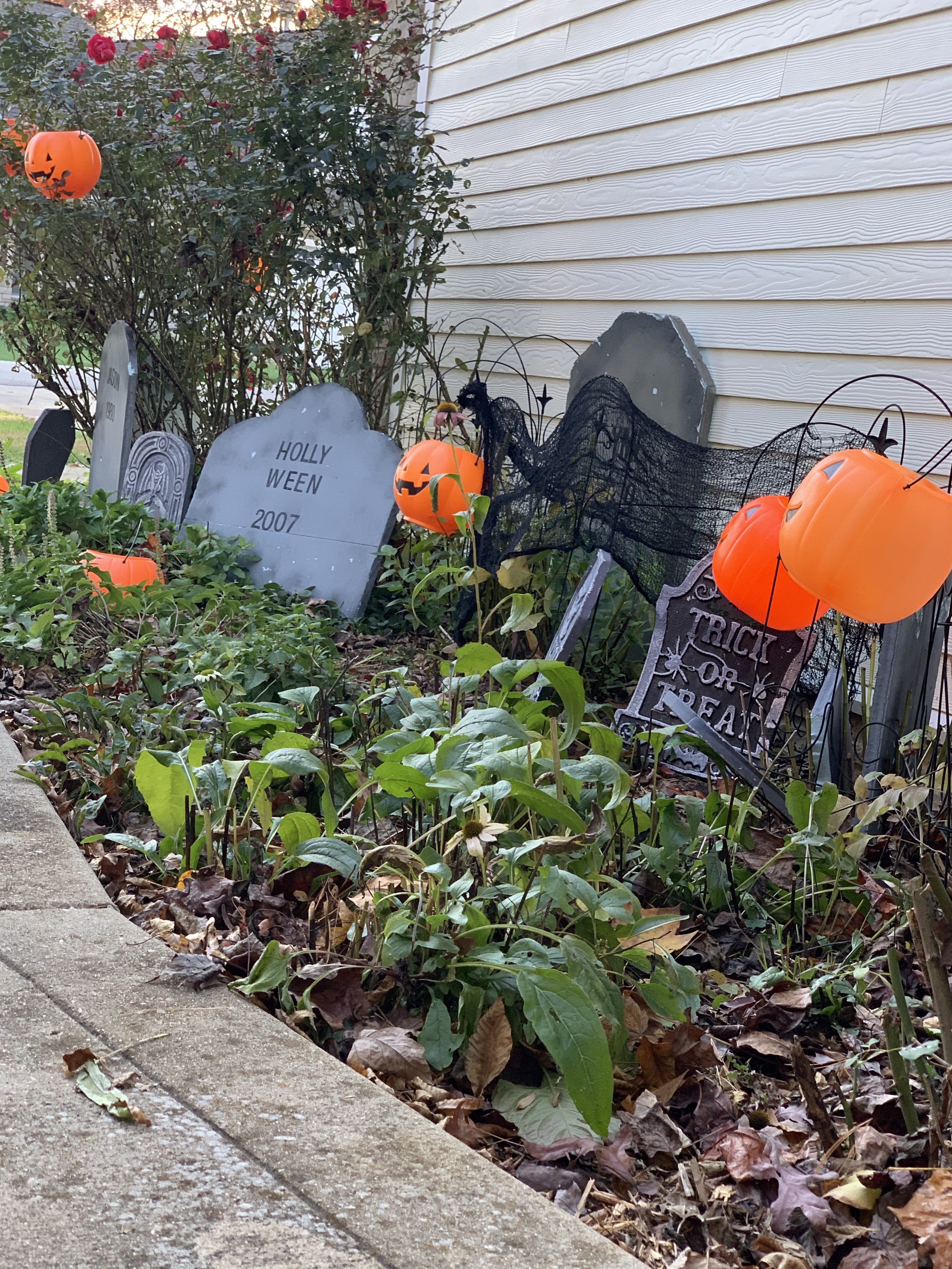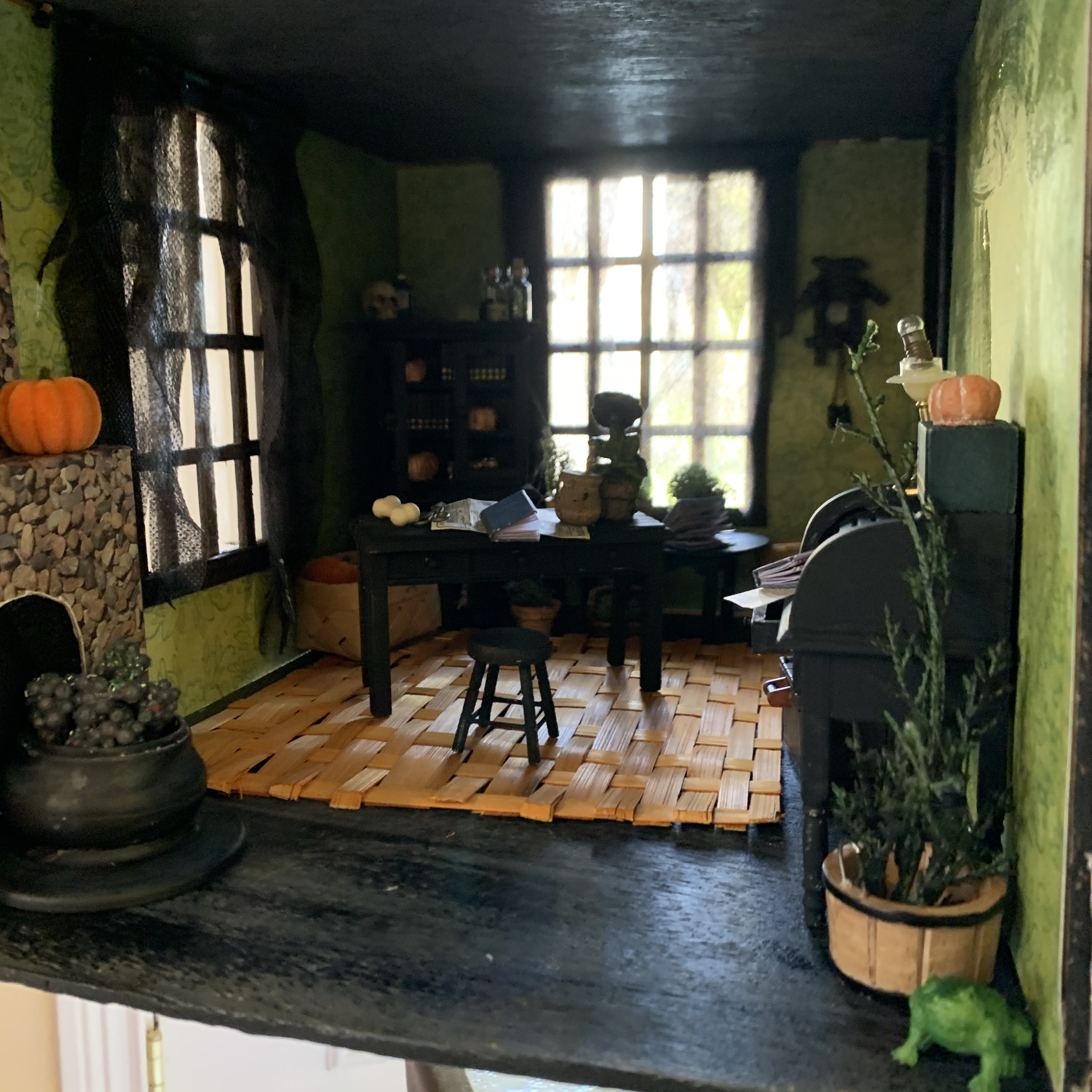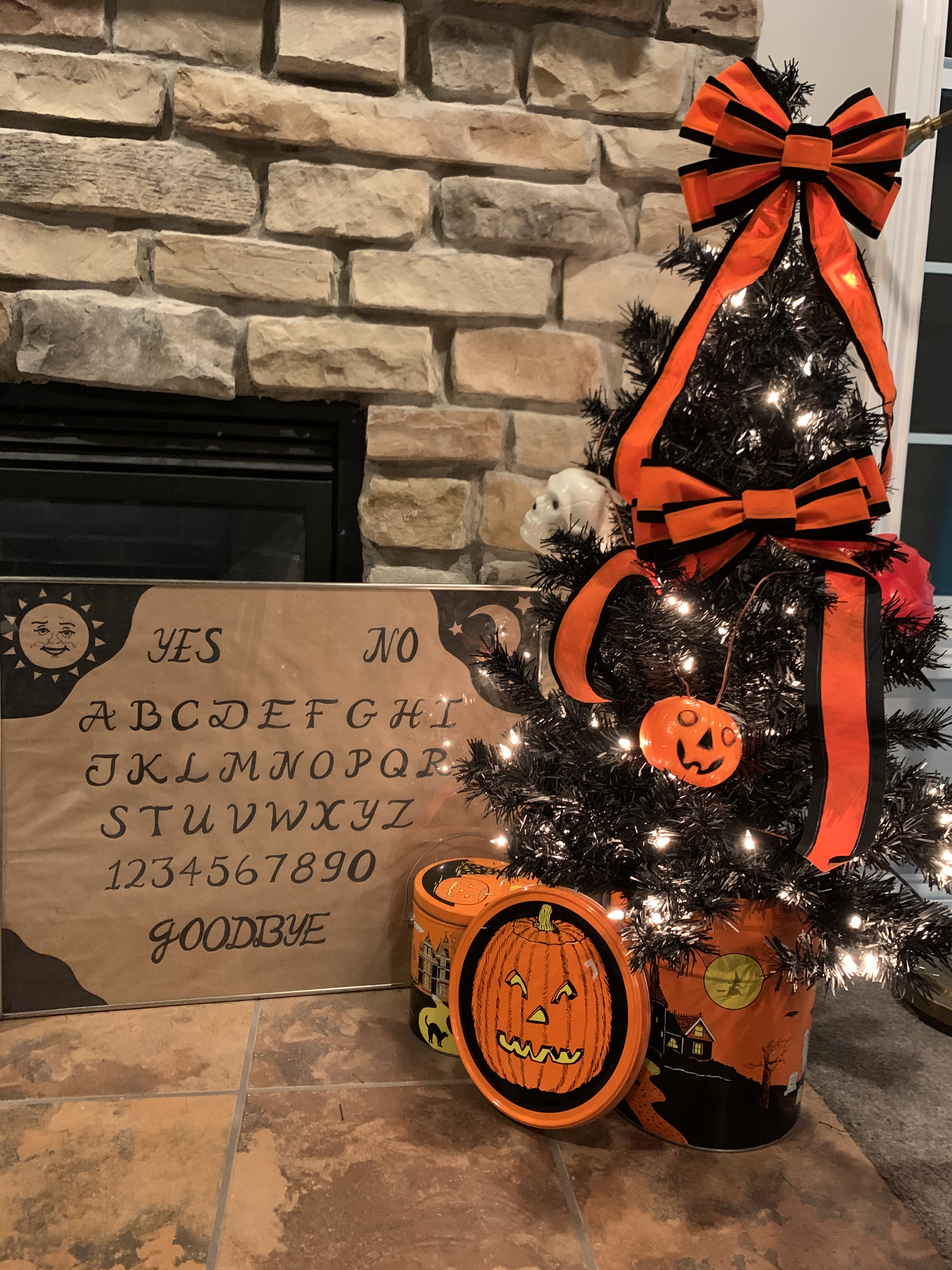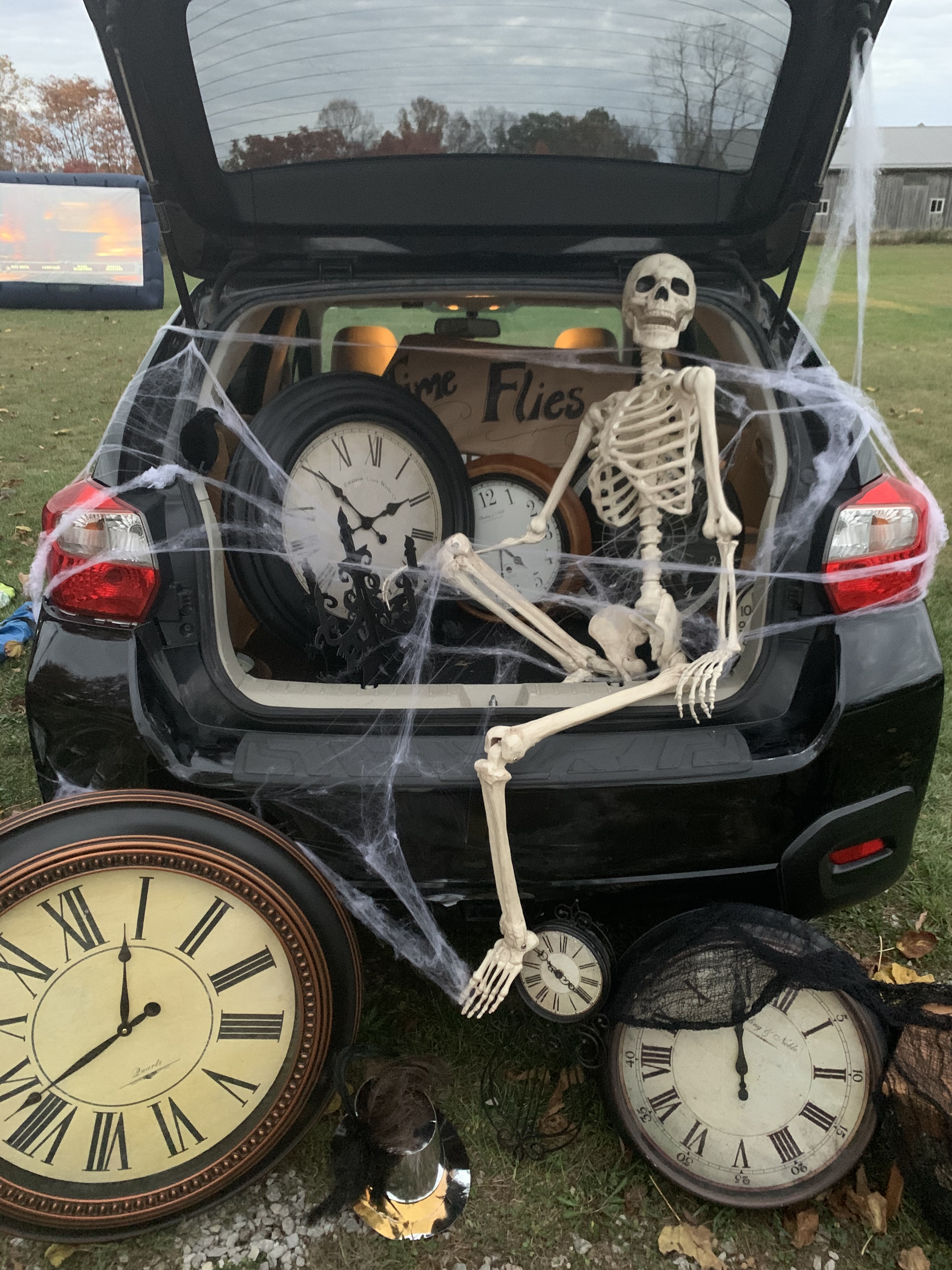 This year’s Halloween display includes some thrifted decor…a tree with vintage ornaments, jack-o-lanterns with battery operated tea lights, and a few other tricks and treats. We also projected onto a sheet in one of our front windows to create the illusion of ghosts moving around inside. …and I made a Halloween candy catapult for socially-distanced distribution of candy. My trunk-or-treat theme this year was time flies…which seemed poignant for nearly a year of dealing with the ongoing pandemic…because we are all wishing it will fly by and everything will get back to normal ASAP.