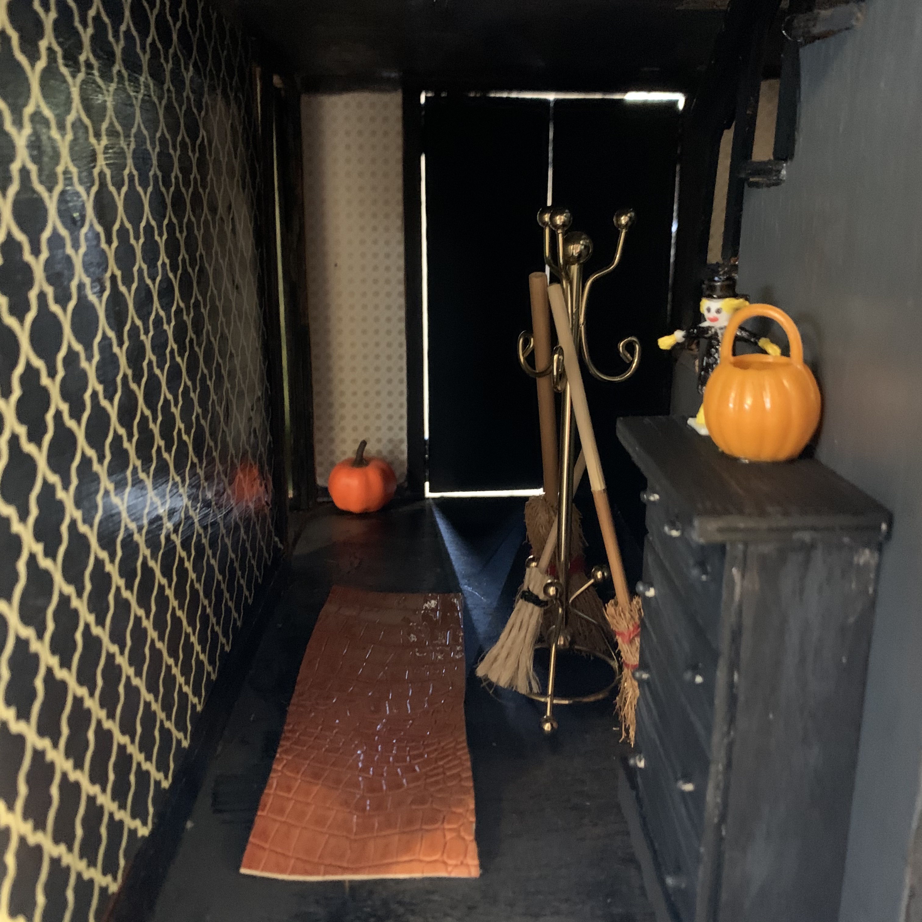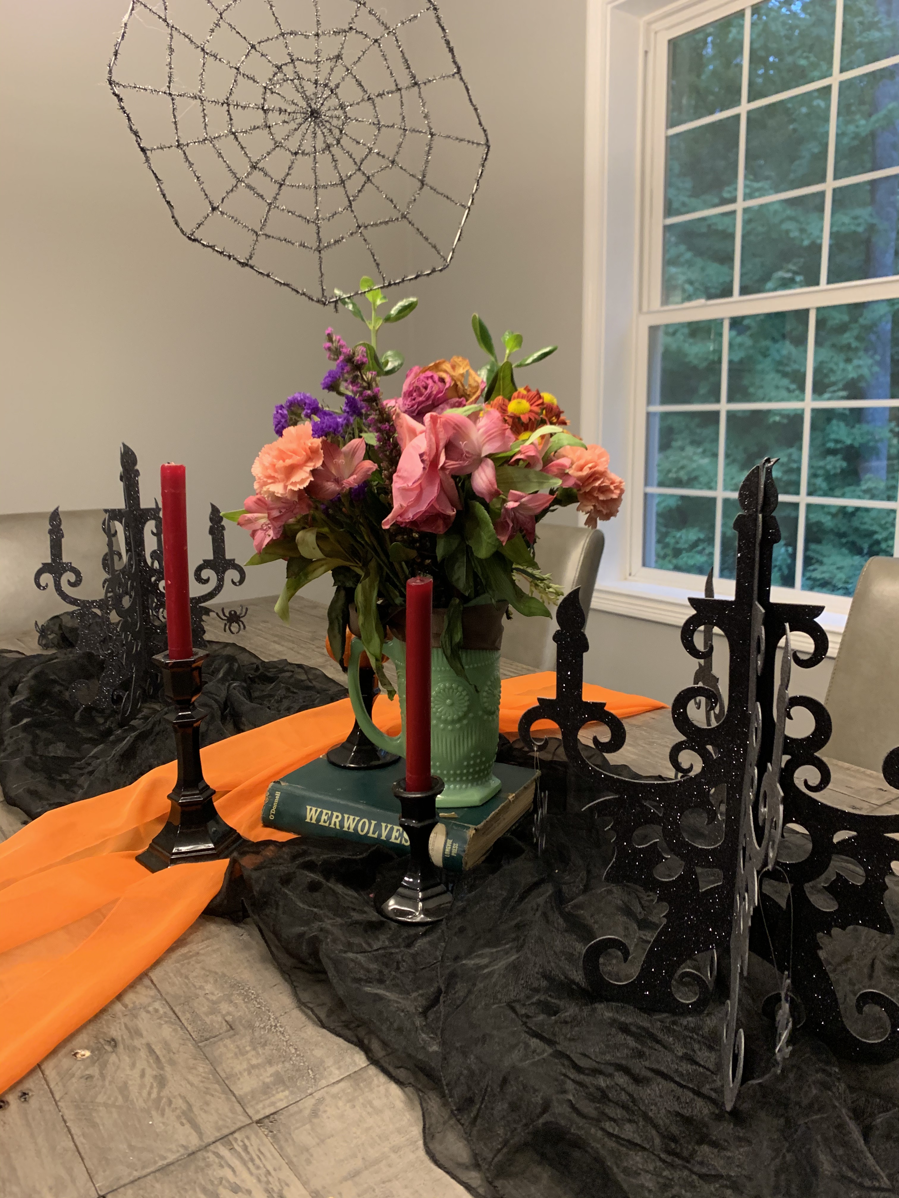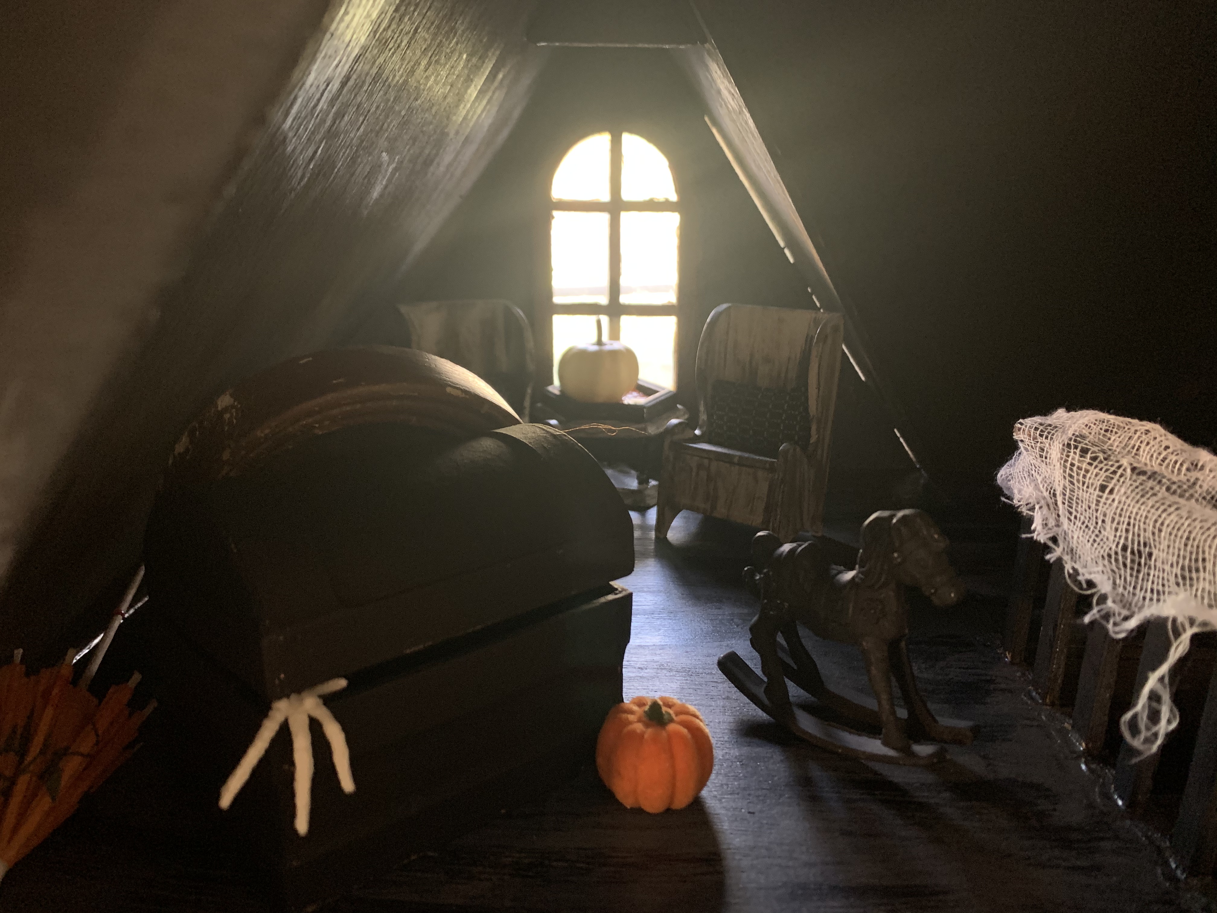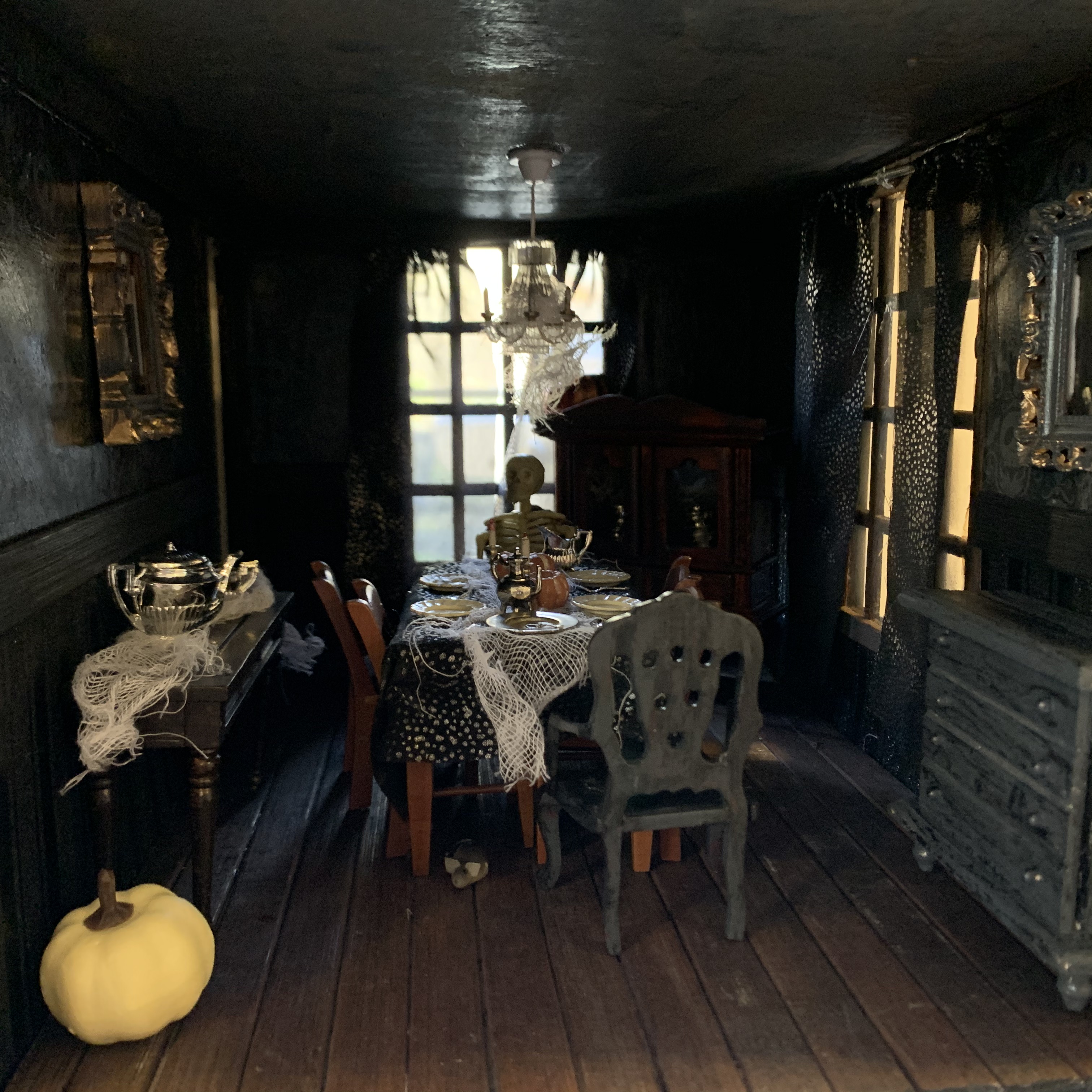 This year’s Halloween display includes some thrifted decor…a tree with vintage ornaments, jack-o-lanterns with battery operated tea lights, and a few other tricks and treats. We also projected onto a sheet in one of our front windows to create the illusion of ghosts moving around inside. …and I made a Halloween candy catapult for socially-distanced distribution of candy. My trunk-or-treat theme this year was time flies…which seemed poignant for nearly a year of dealing with the ongoing pandemic…because we are all wishing it will fly by and everything will get back to normal ASAP.