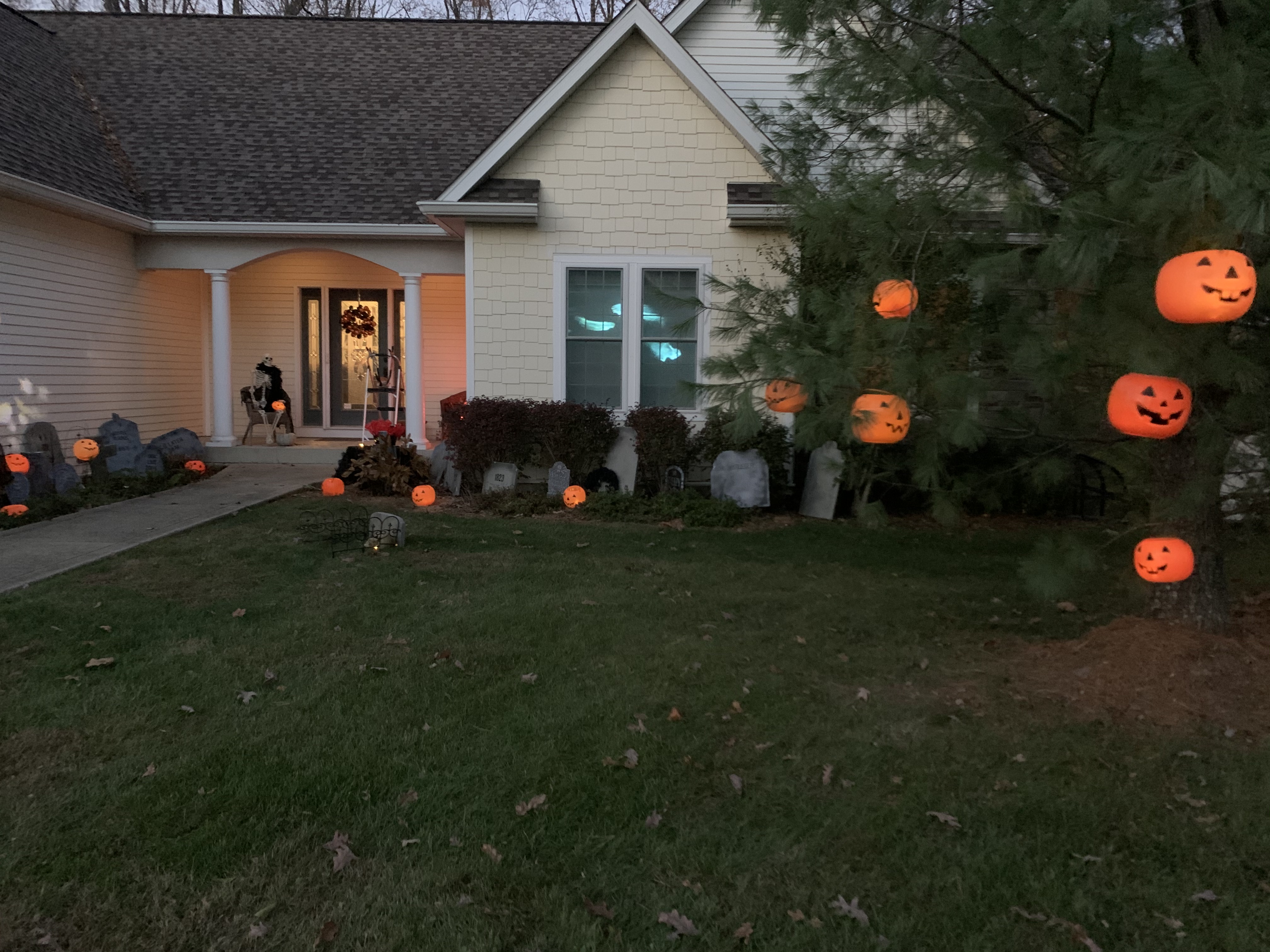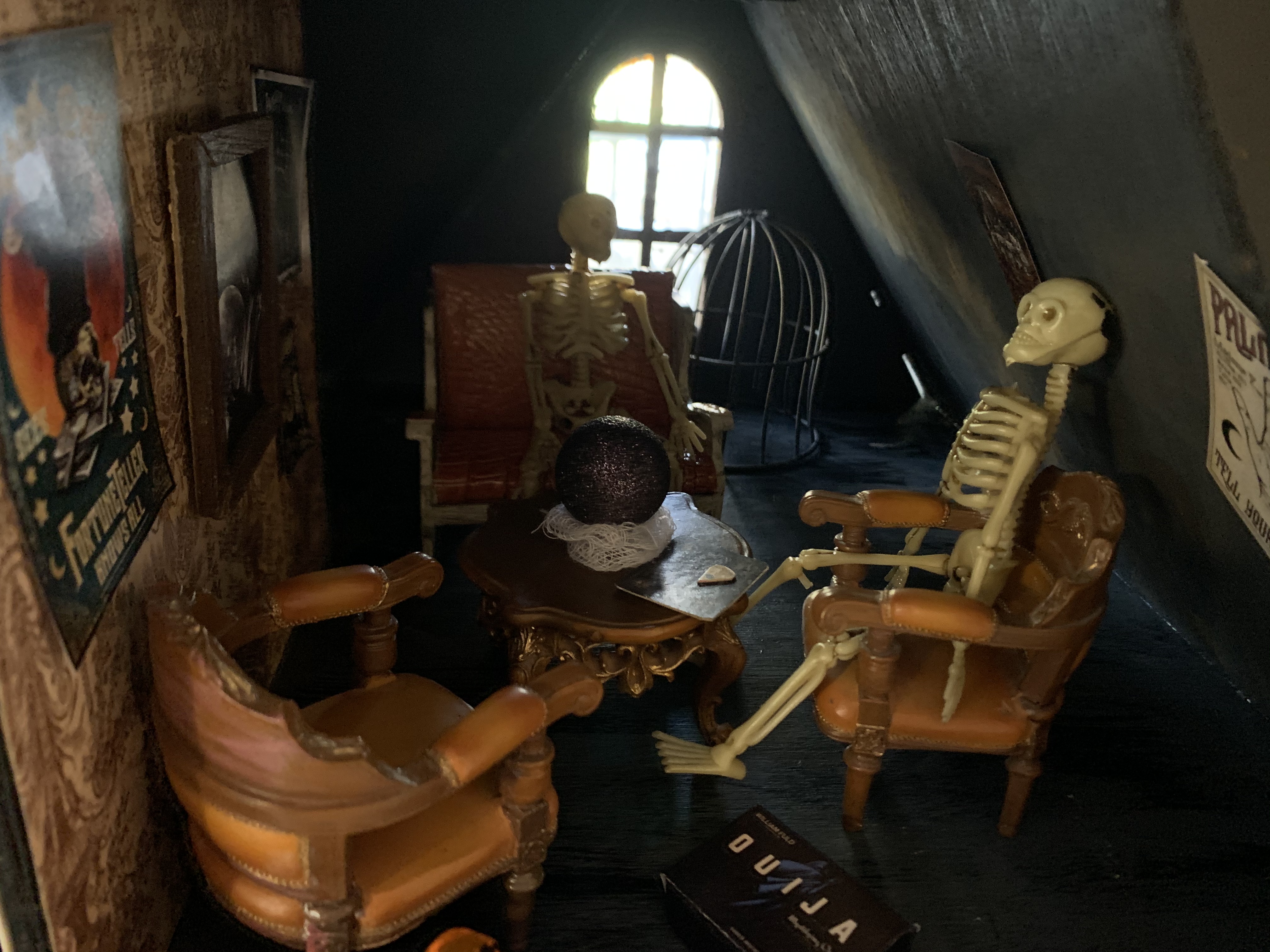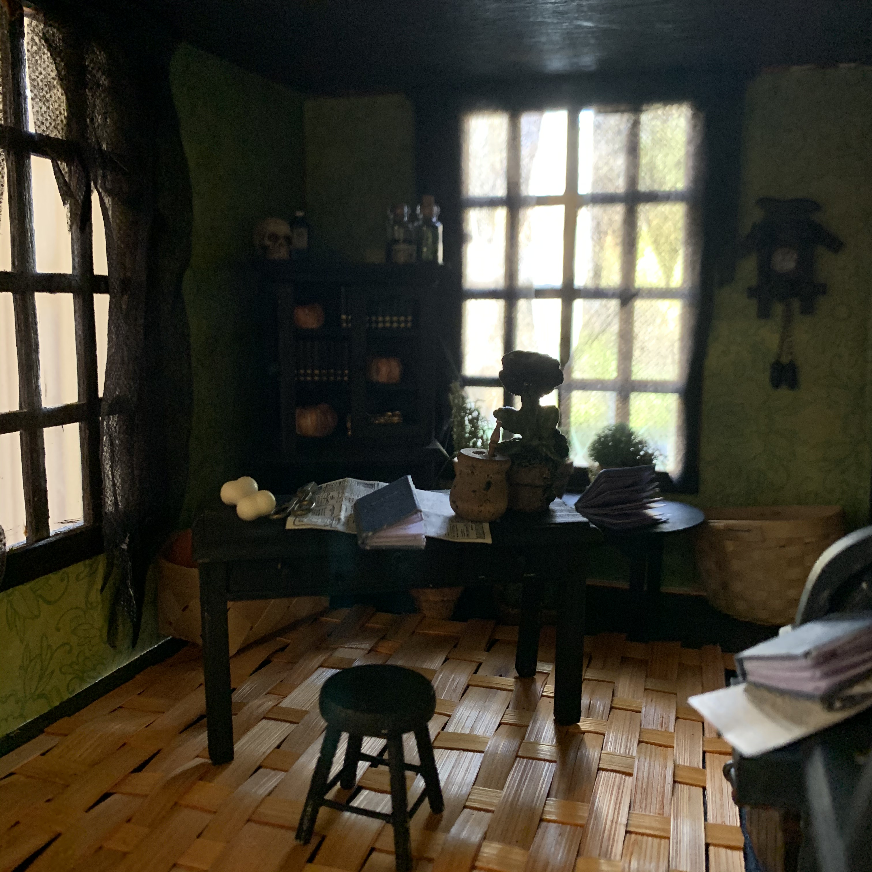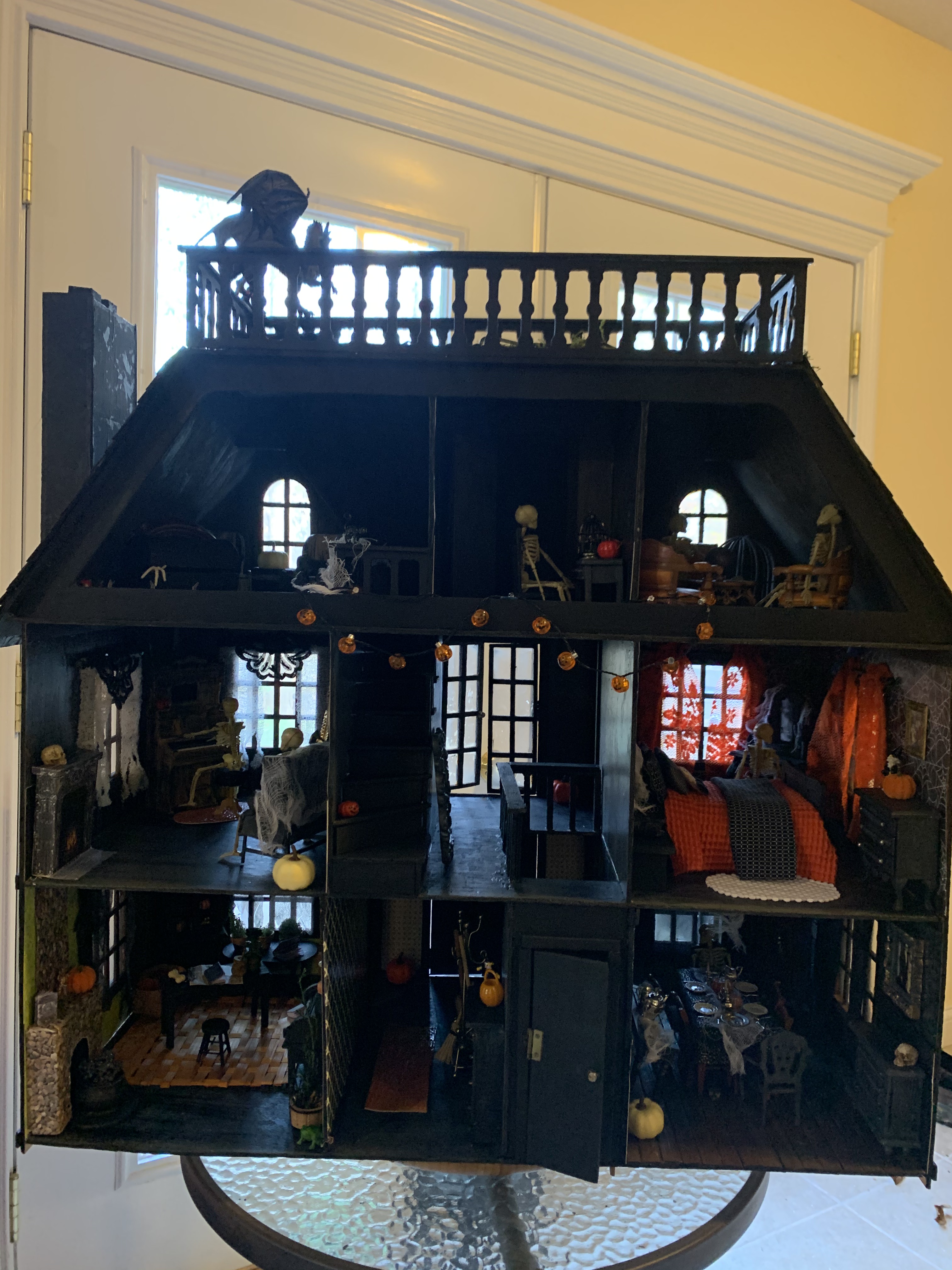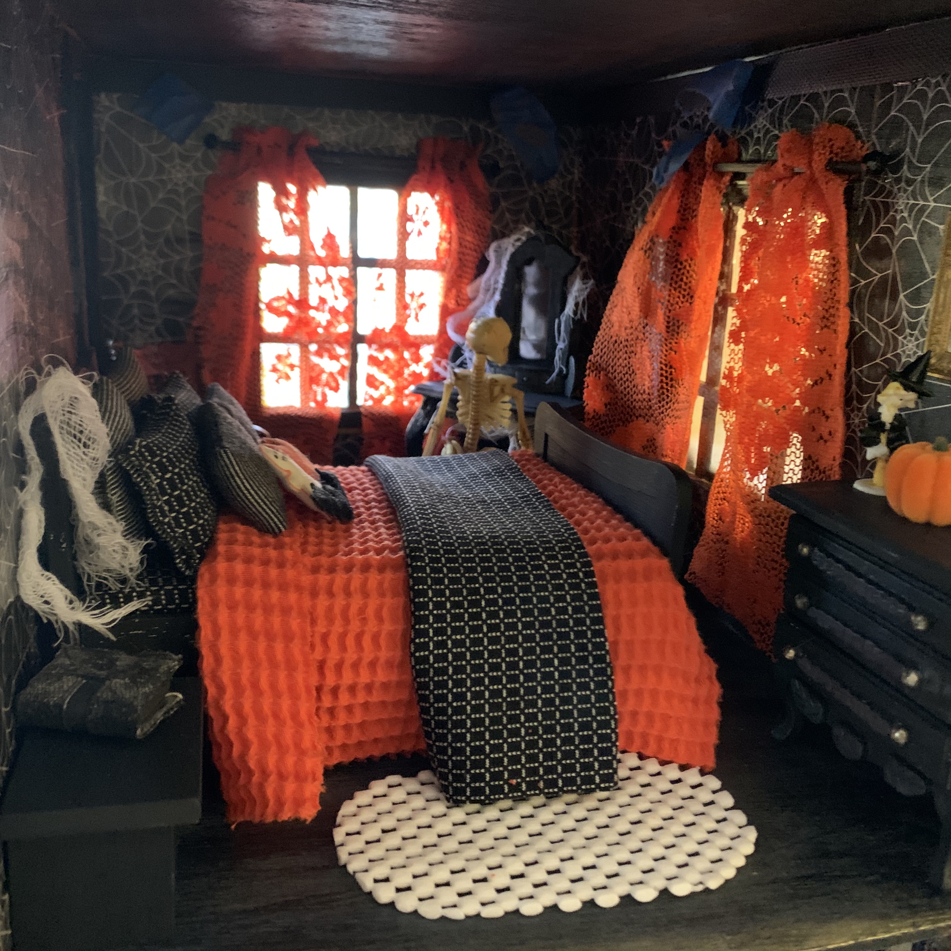 This year’s Halloween display includes some thrifted decor…a tree with vintage ornaments, jack-o-lanterns with battery operated tea lights, and a few other tricks and treats. We also projected onto a sheet in one of our front windows to create the illusion of ghosts moving around inside. …and I made a Halloween candy catapult for socially-distanced distribution of candy. My trunk-or-treat theme this year was time flies…which seemed poignant for nearly a year of dealing with the ongoing pandemic…because we are all wishing it will fly by and everything will get back to normal ASAP.