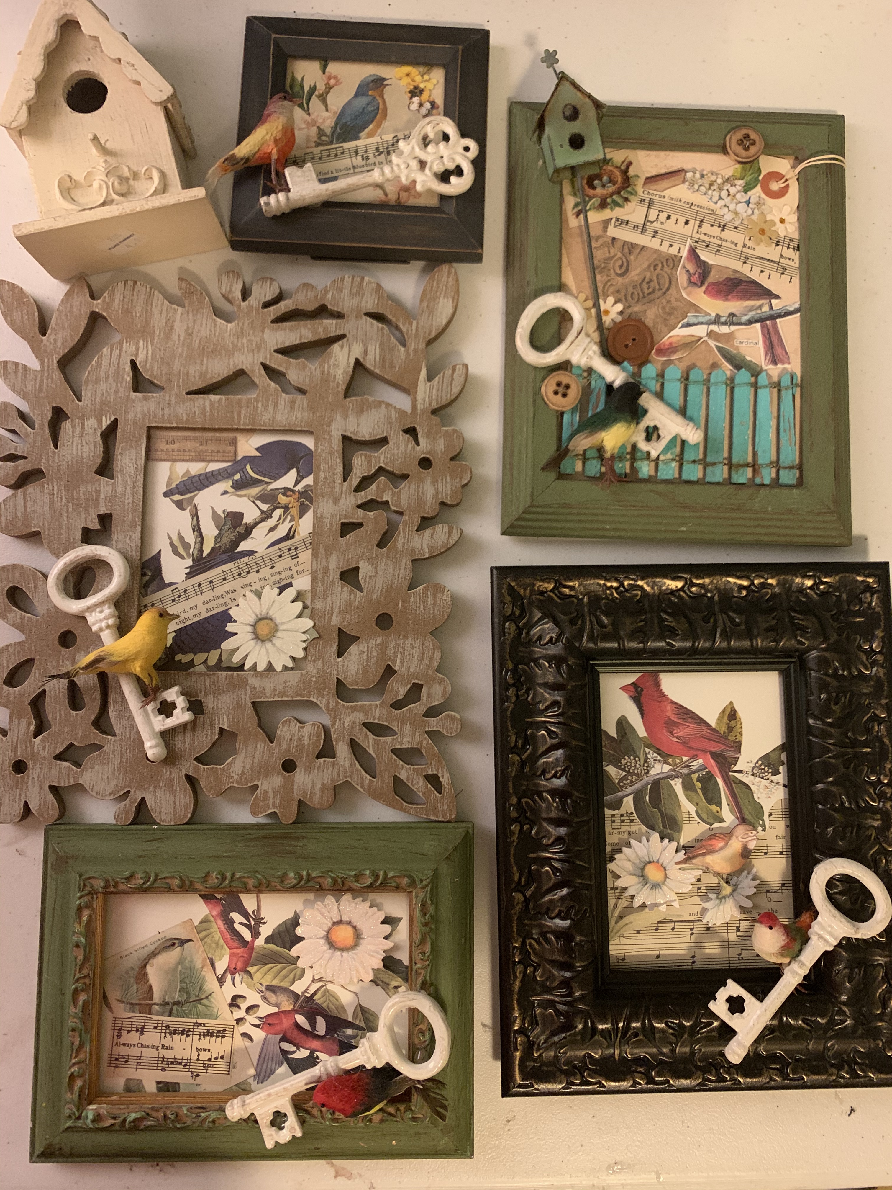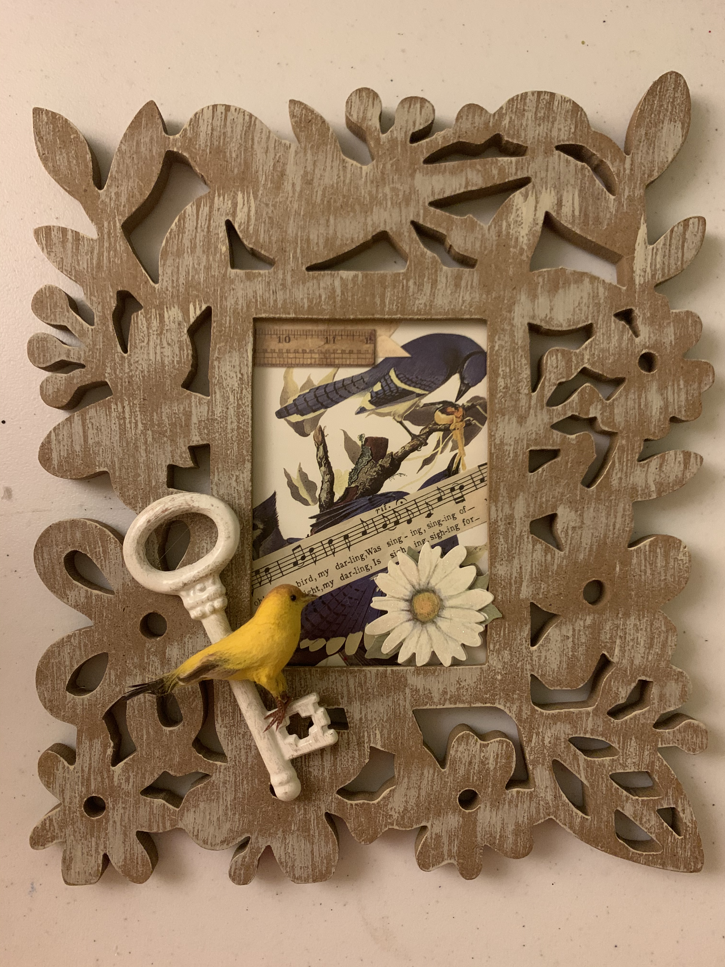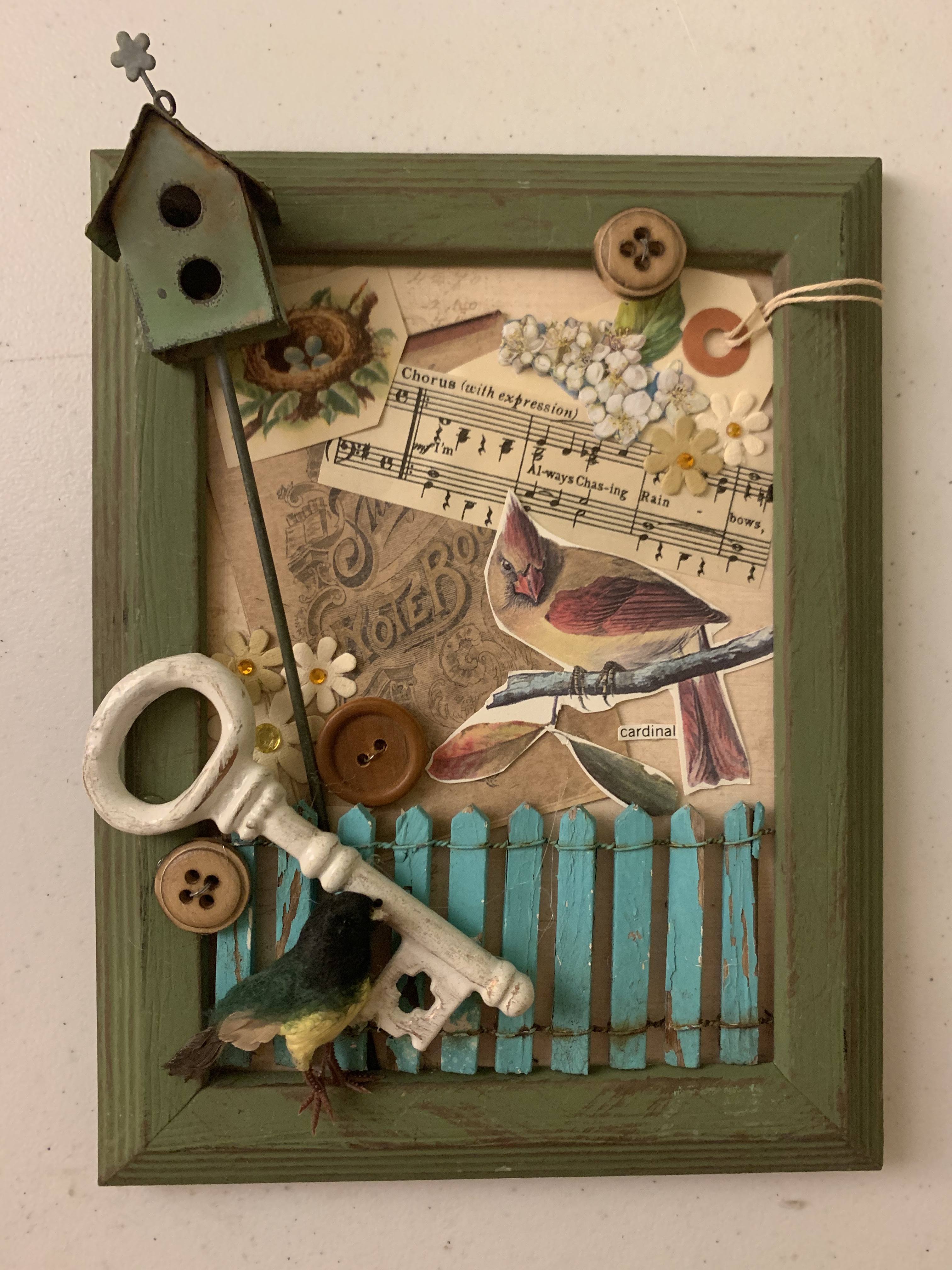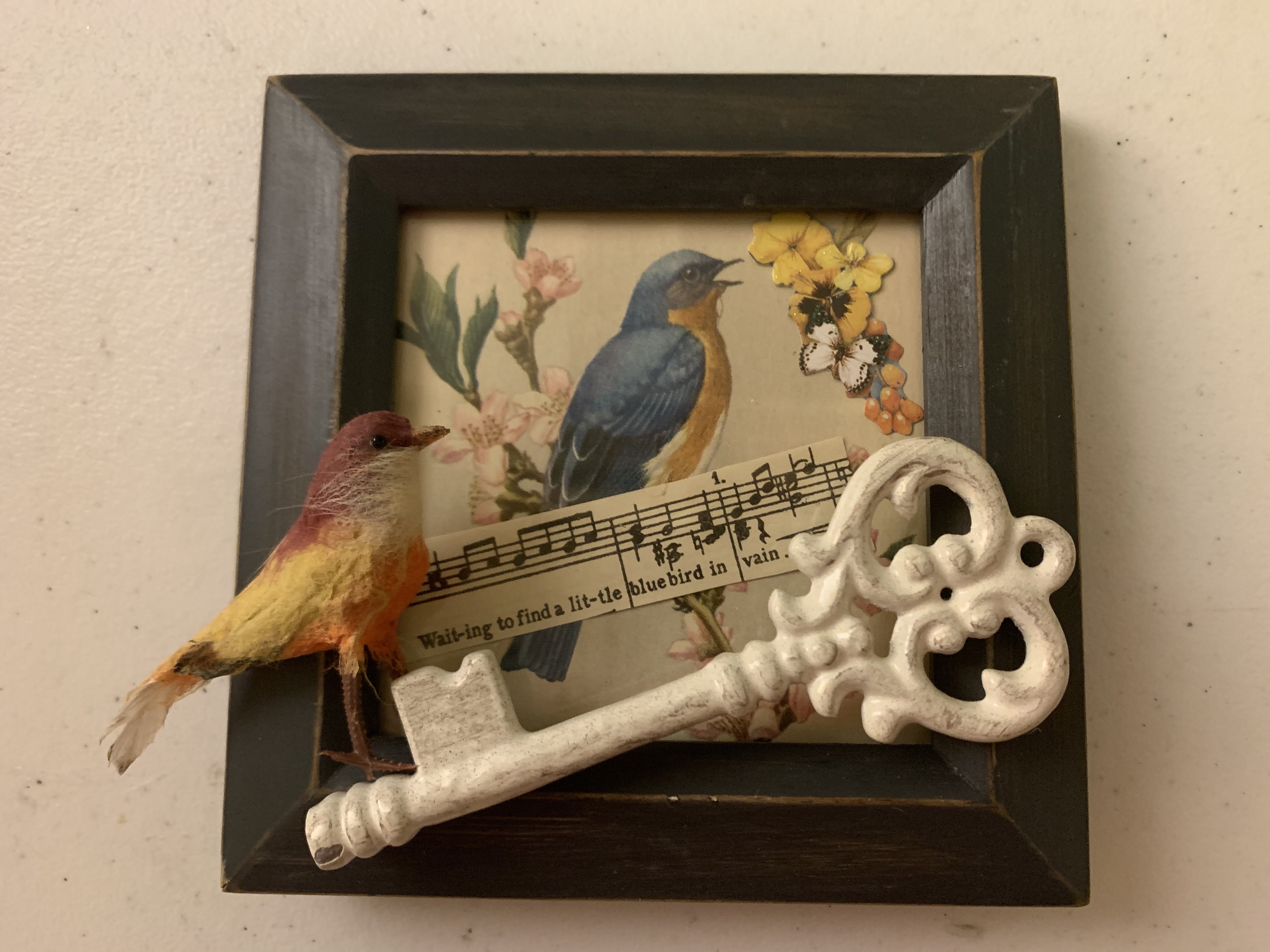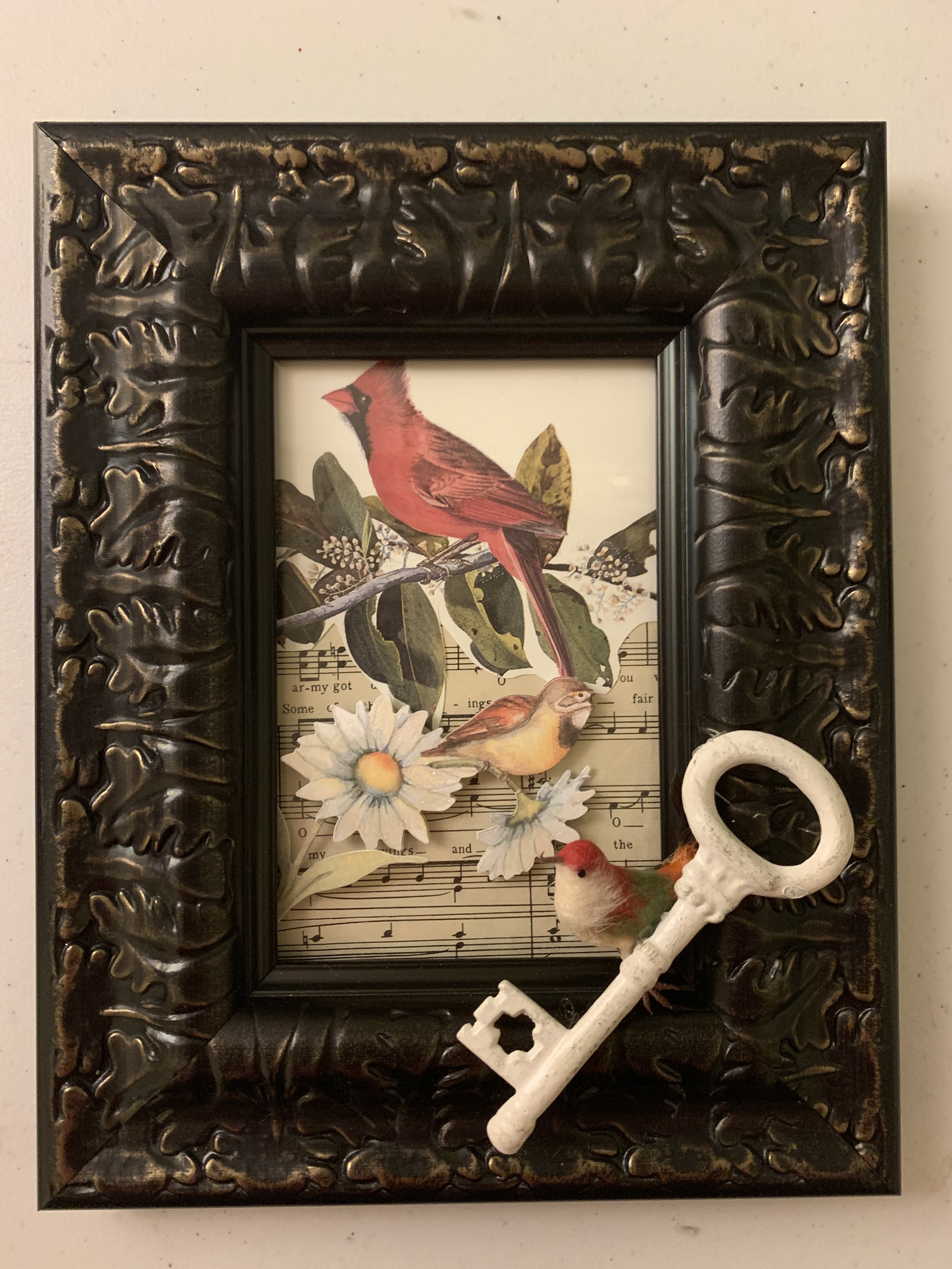 Here’s a series of collages that I made for some ornithologists I work with on an NSF project. Each one in the series includes a 3D bird, along with bird images, sheet music (that references birds or things that reminded me of birds, and keys. One also feature a cute bird house I found. All thrifted, right down to the frames…and all very fun to make and give as a gift to celebrate the new year.