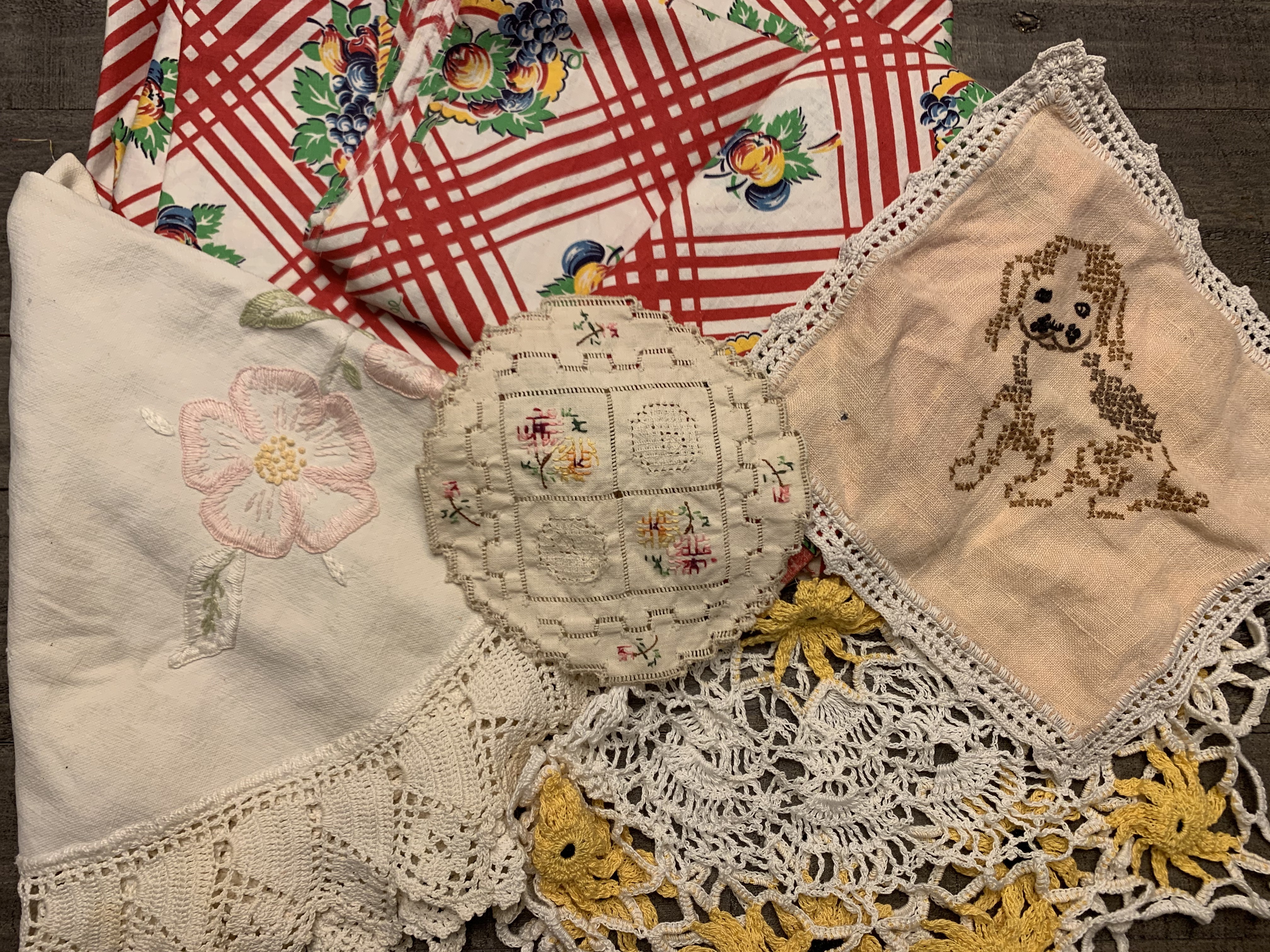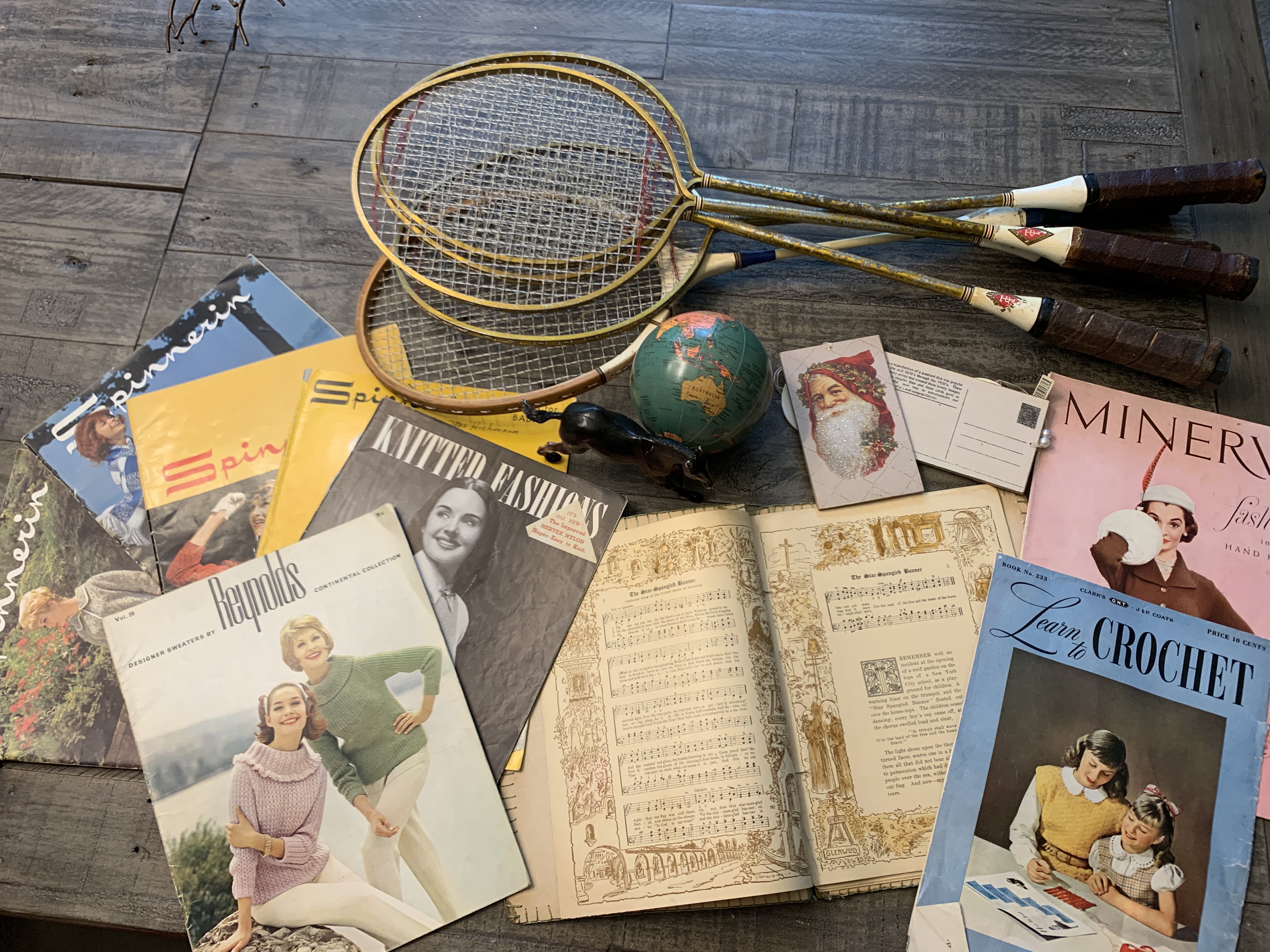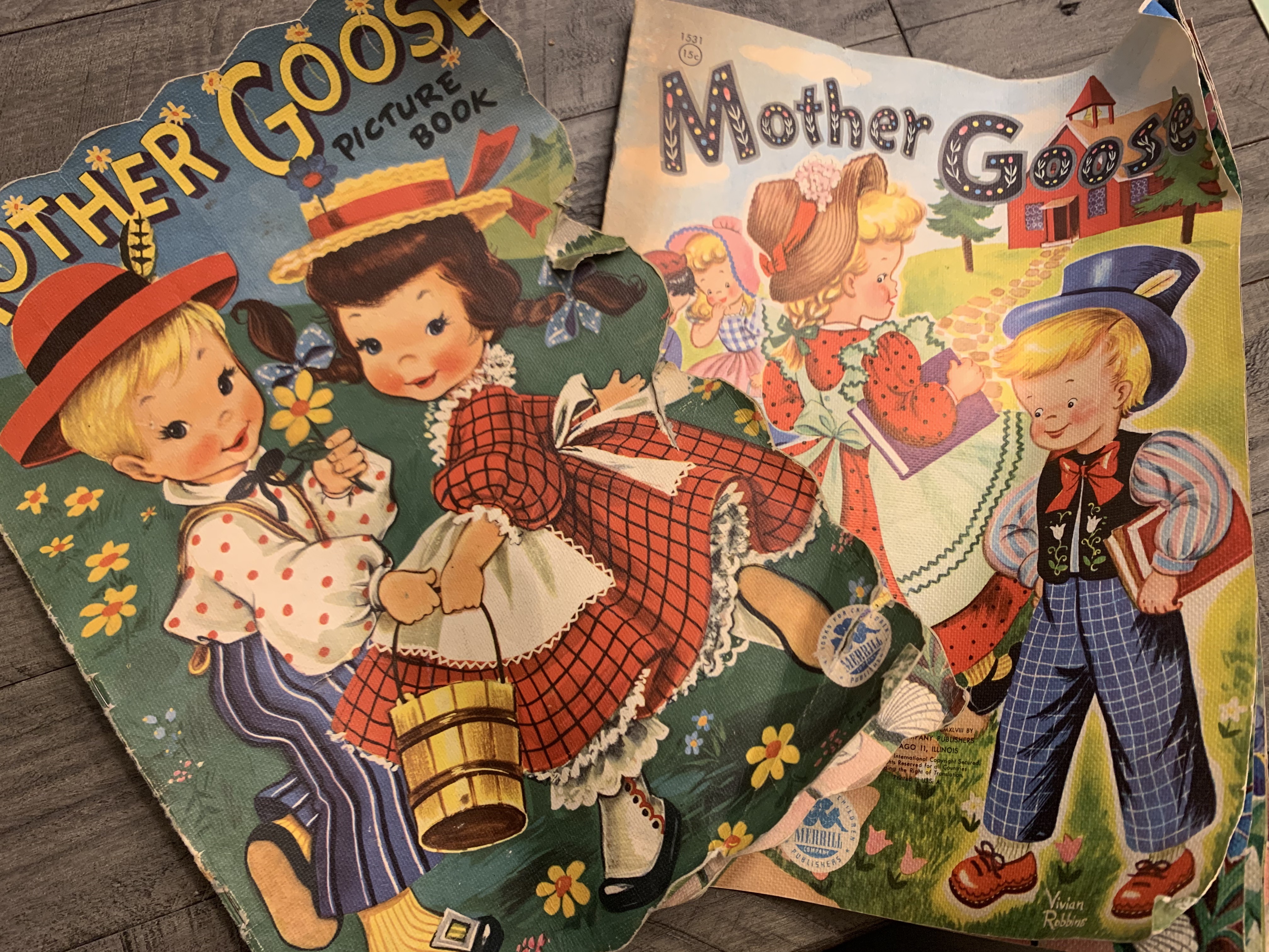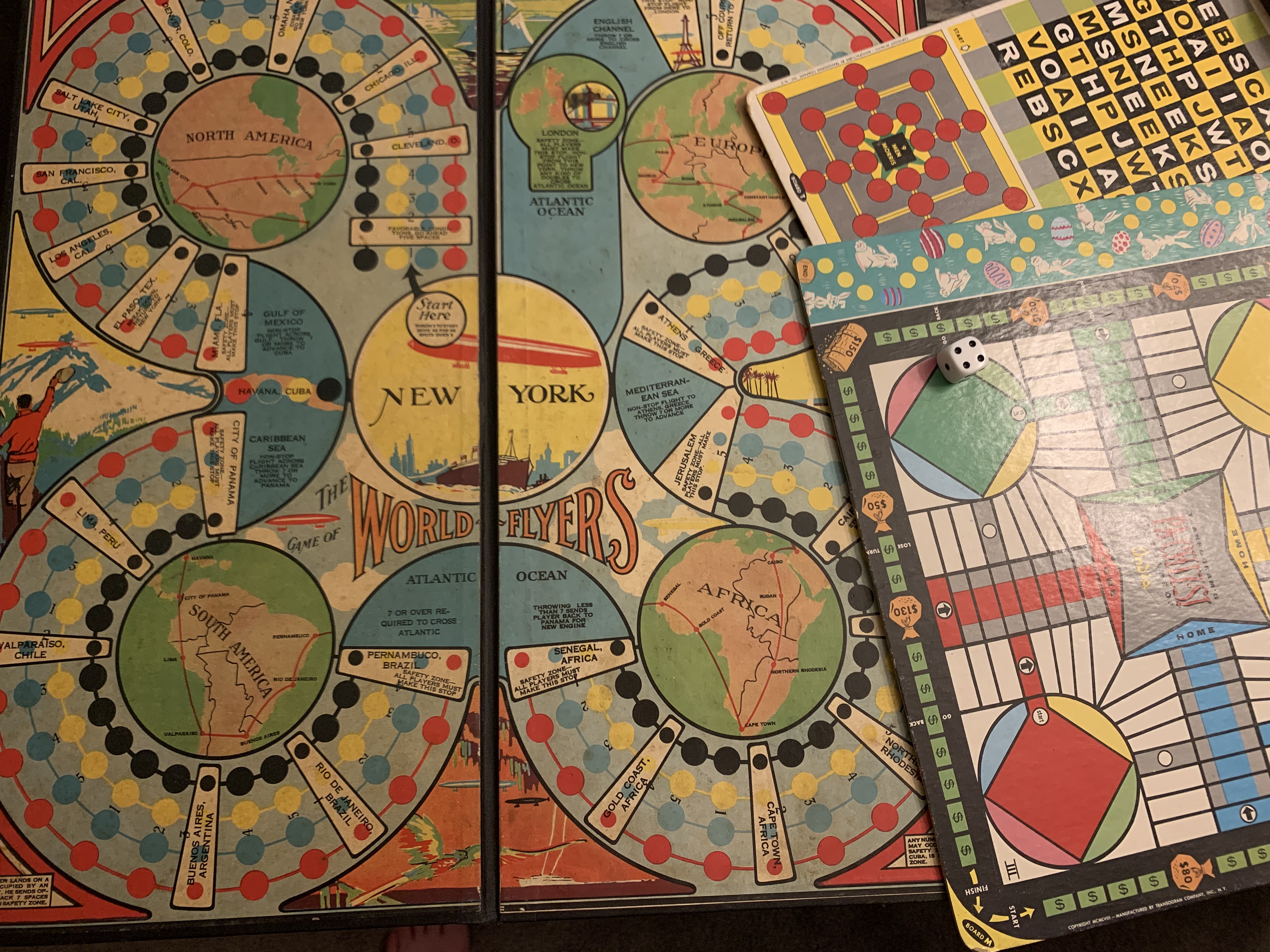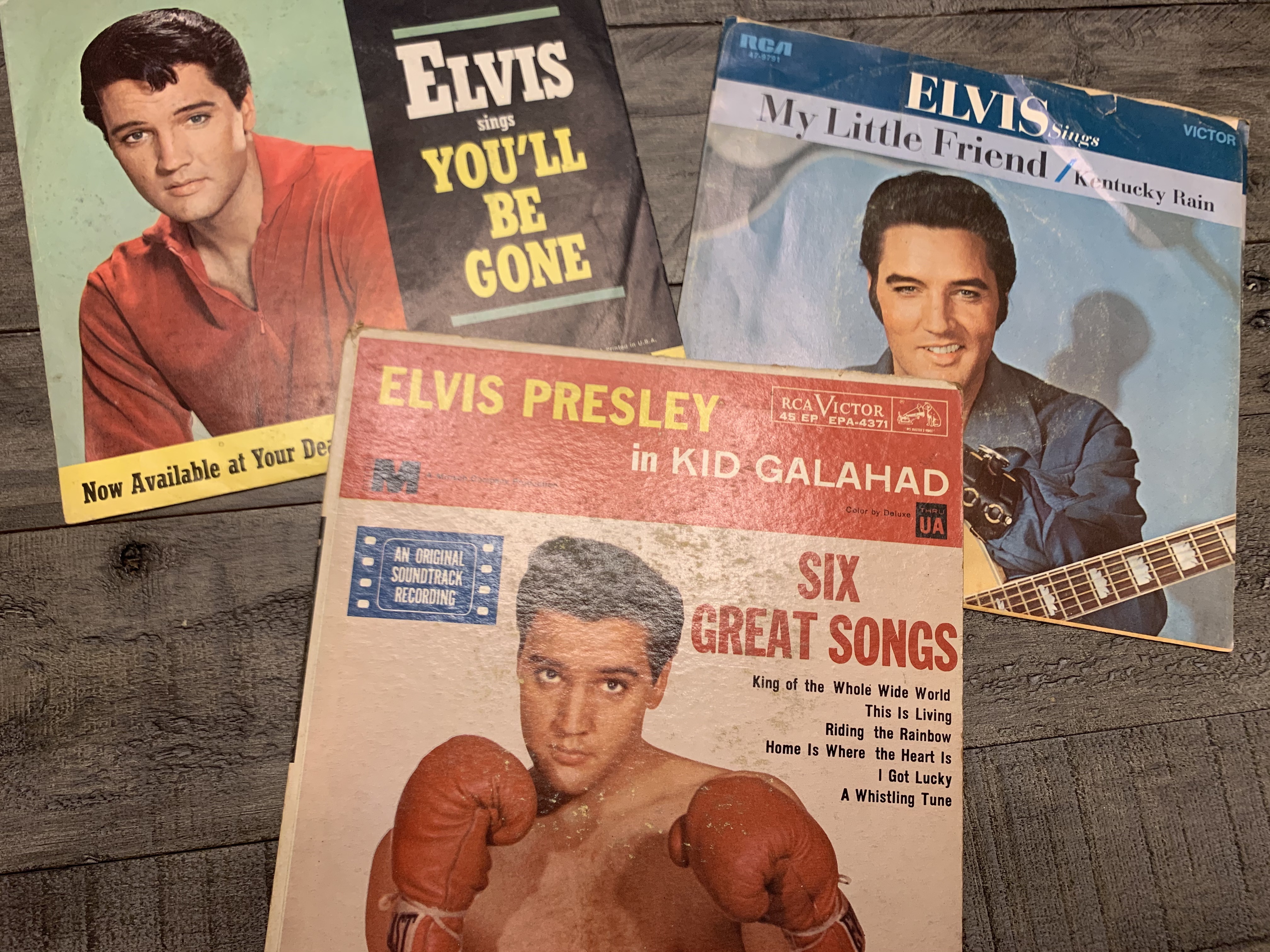 Okay, that was my lame attempt at a play on the “April showers bring May flowers” saying…since this post shows a combination of thrifted finds from April and May. Highlights in this batch include: a retro tiki tin, a cool vintage game board for a game called “World Flyers”, vintage children’s books, early Elvis records, some vintage linens and some fun decor for Halloween and some awesome vintage Christmas finds.