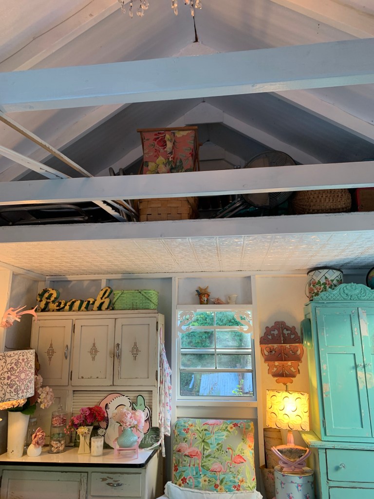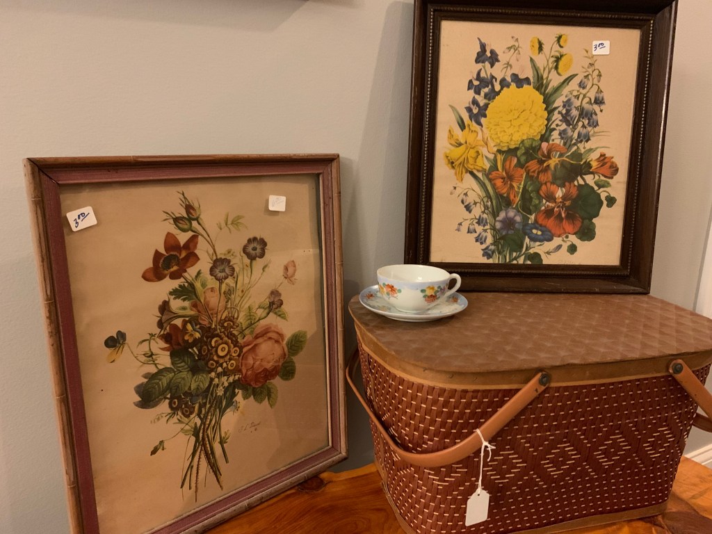 Space–or the lack thereof–is a perfect place to start this week’s blog post. I was up in Indianapolis again this weekend and on the way to breakfast with my mom we came across a sign that said “Vintage Sale” – when we came back from breakfast my mom suggested that we stop in to see what was there…and low and behold there was a Redmon basket sitting right up front. Turns out, the woman holding the sale was trying to clear out a garage, that had gotten filled up when she emptied out her storage shed to make a she shed. The shed, and then the garage, had been crammed full of items from a vintage store that she and her daughter had. Anyway, back to the sale: In addition to the basket I also found a few flower prints and a teacup…and I got to tour the she shed. It was hands-down the coolest shed I’d ever seen, and I have a pinterest board full of them!