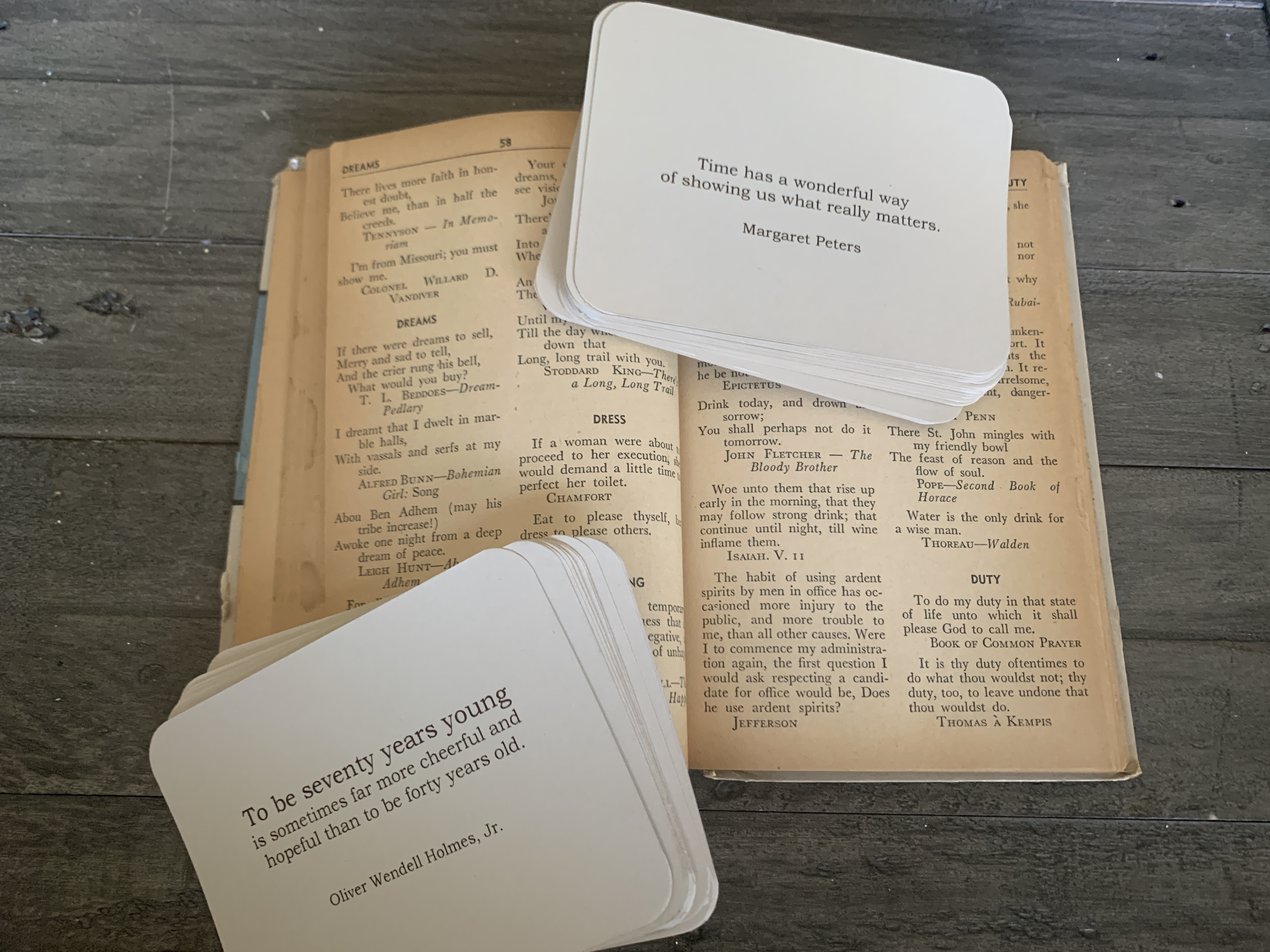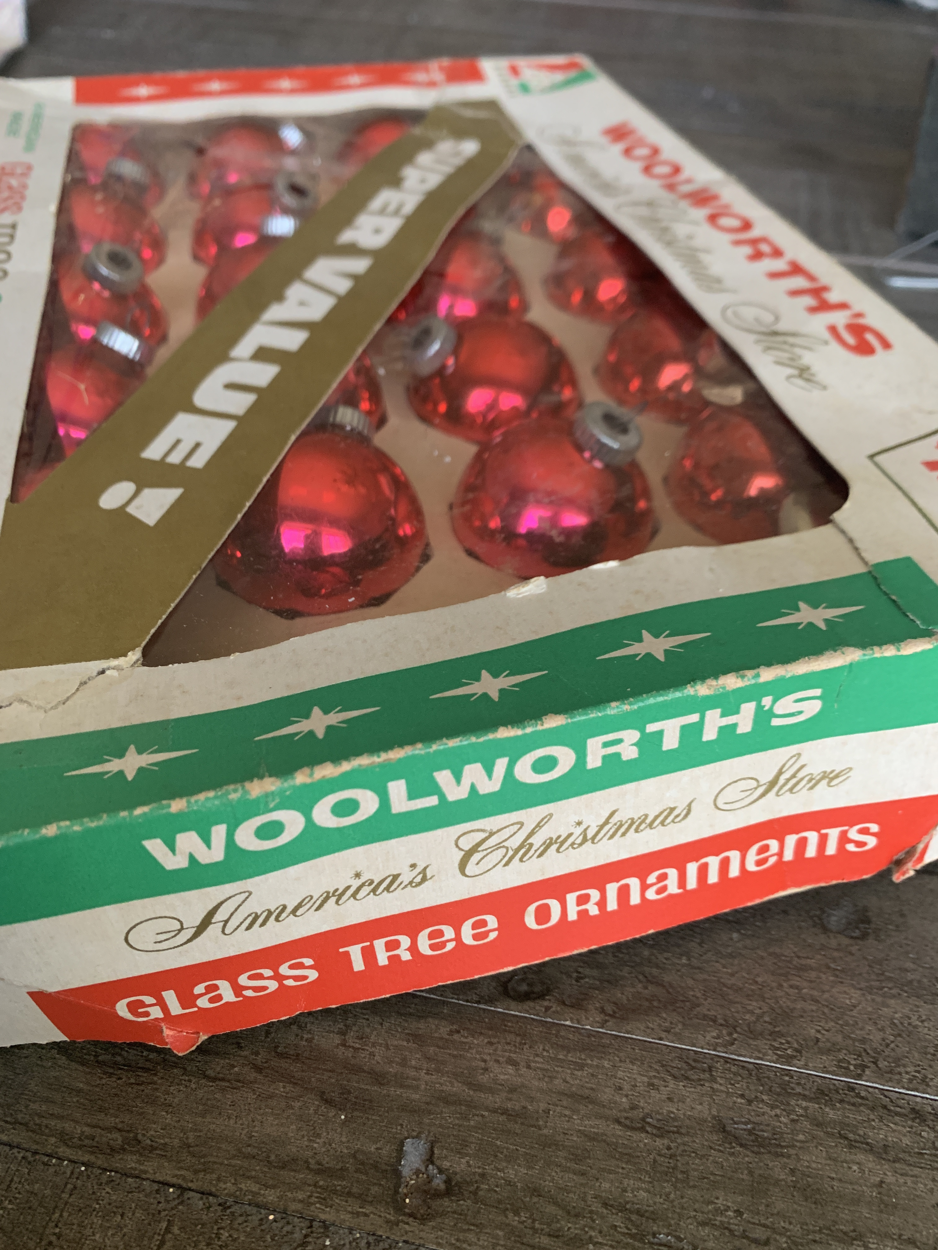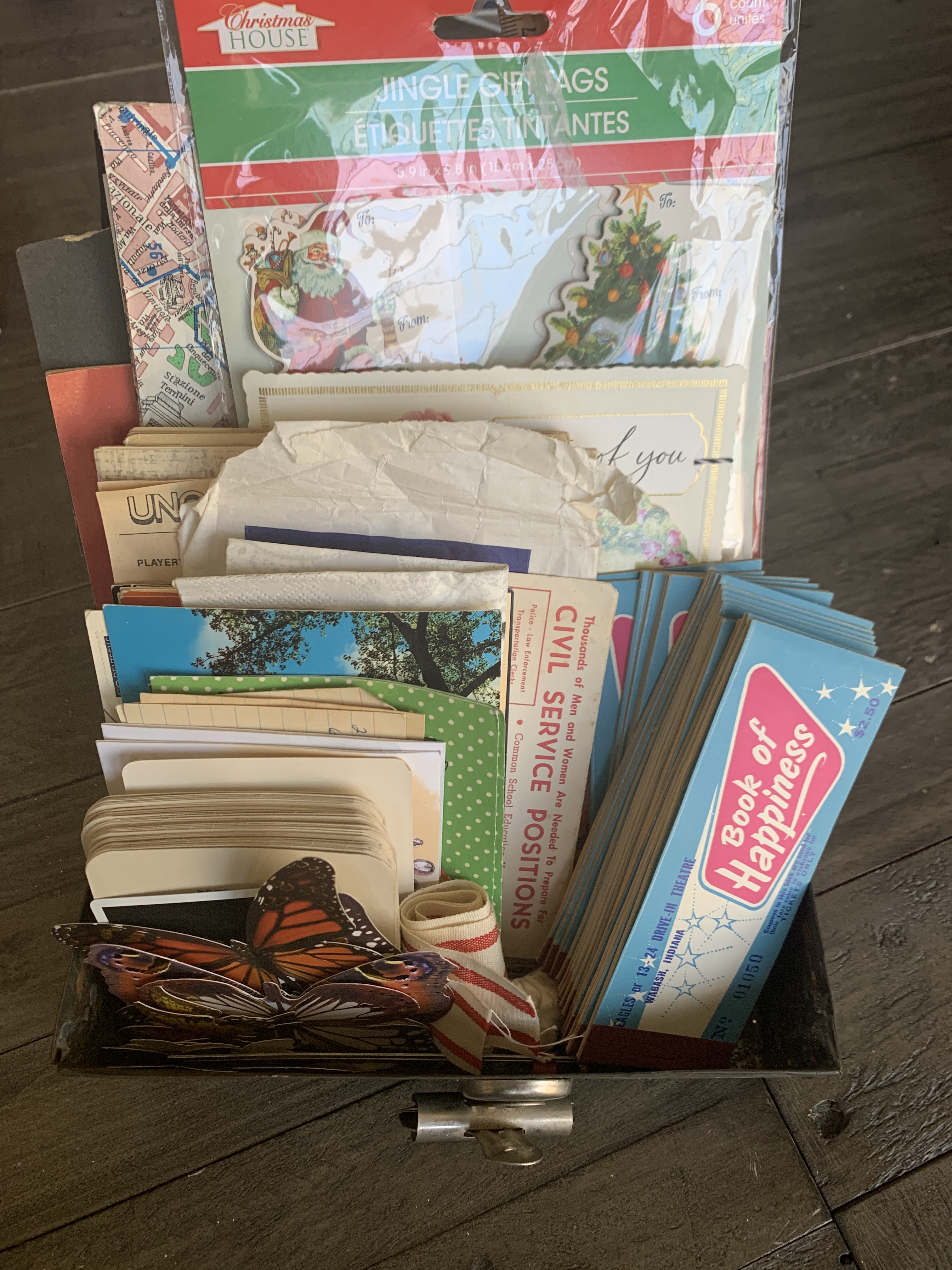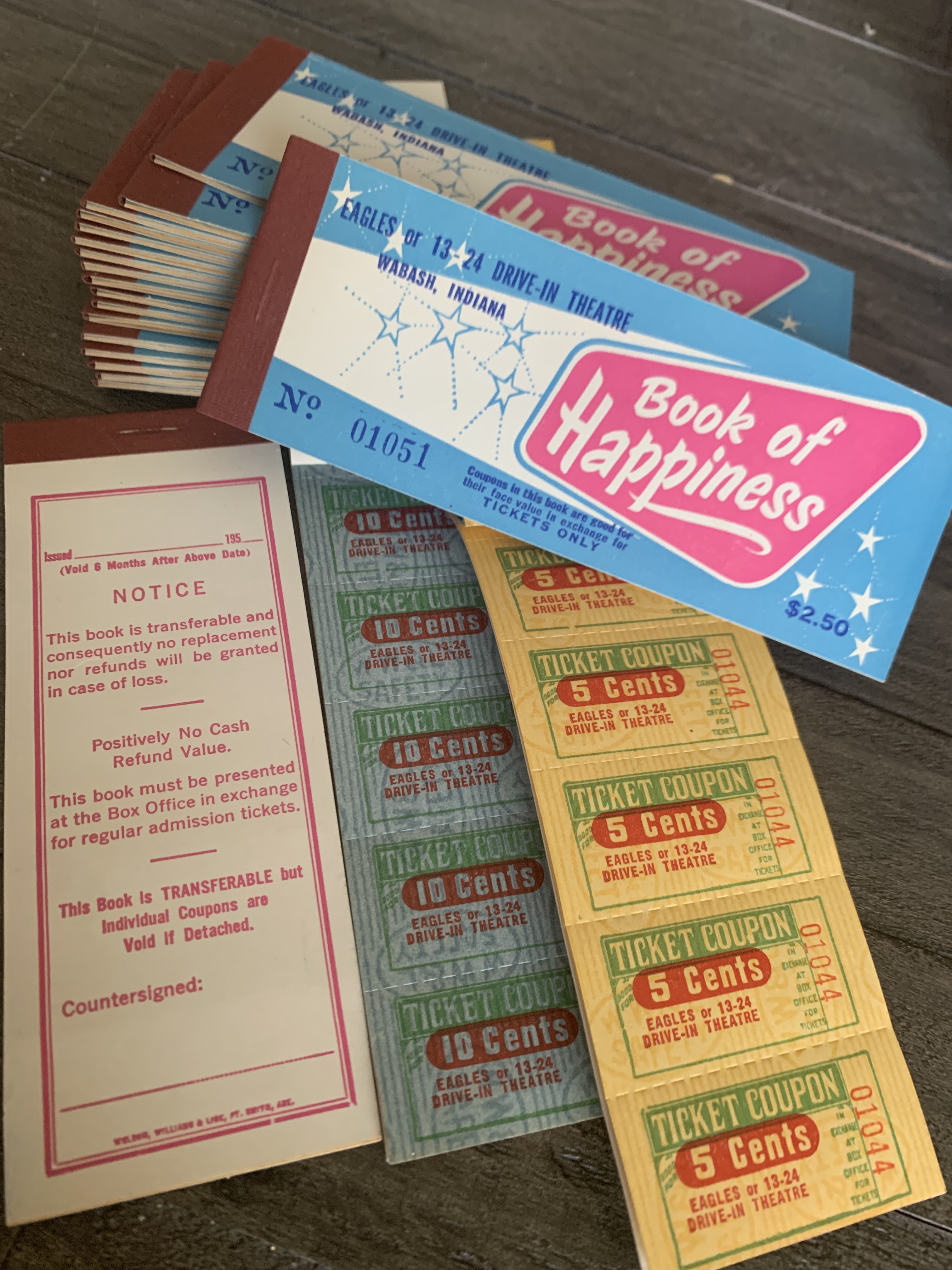 I have a definitive answer to the question: “Can money buy happiness?” – or in the case of thrifting, “Can less money buy happiness?” The answer is a resounding “YES!” One of my favorite finds from this week’s thrifting adventures was a set of vintage coupon books from the Eagles Drive In Theater in Wabash, IN…each appropriately titled the “Book of Happiness.” Other treasures in the mix: some badminton racquets and a feathered birdie, various things to be used on crafts, some tins that match a set that I have – they look vintage (but aren’t), a set of illustrations for different colleges at Cambridge University, some retro travel maps and pamphlets, a Gremlins Halloween Costume (sadly minus the mask) and some Shiny Brite and Rauch ornaments — it always makes me happy when I’m able to rescue some from the bins…but it sure is a bummer when I see smashed up pieces that I didn’t get to in time.
