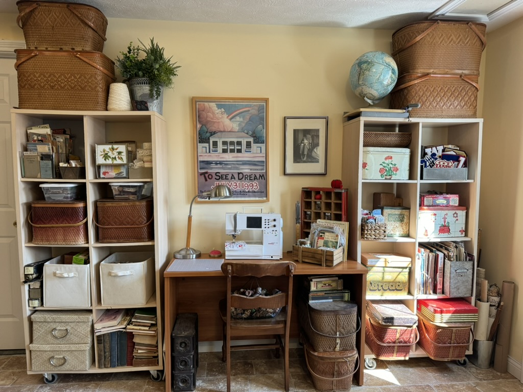 My shelving units were a light wood color, but the other furniture had an orangey woodtone. I’d assumed I’d probably end up painting all the furniture gray or dark brown to make it look like the spaces I’d seen online. But then it occurred to me that the furniture kind of matched the natural color of several of my vintage Redmon baskets…which also make perfect storage containers. So I ran around the house and gathered up all the baskets I could find. Not having to paint anything and being able to incorporate so many of my baskets both as artistic elements as well as functional storage within the space was a win-win!