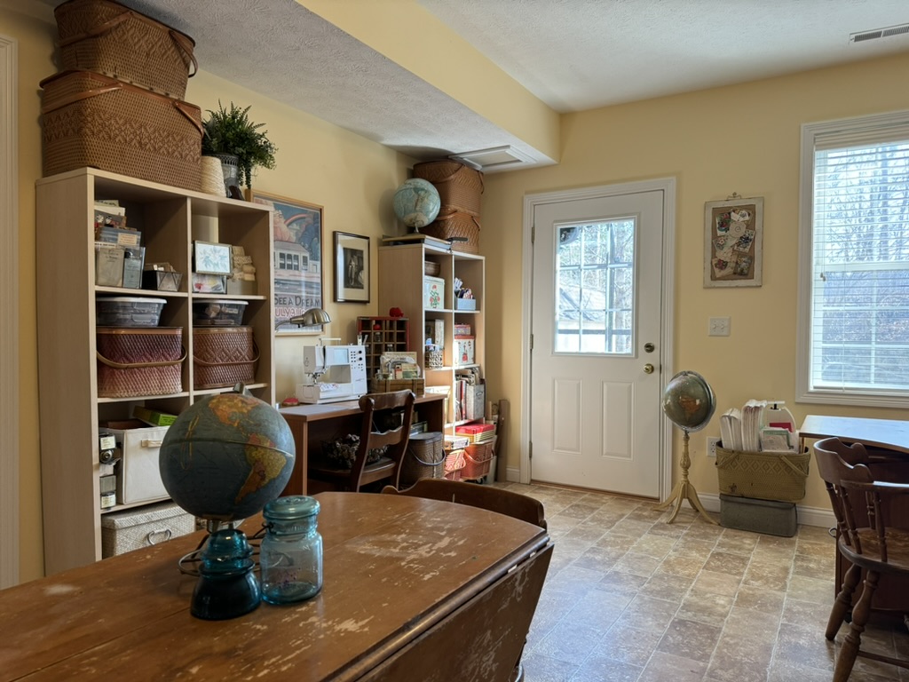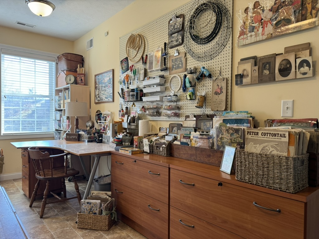 The original craft room I’d set up in our new house was in a guest bedroom. That meant that that I was always moving things off and on the bed (that doubles as a space to lay out crafting supplies when its not being used by guests) and move off other surfaces to make space for luggage. But the two worst parts of that room turned out to be the natural lighting, which was always pretty dim even on the best days because the windows face the north and lots of light gets blocked by nearby trees, and the carpet…which always made for vacuuming challenges after crafting projects with glitter or small bits of paper, fabric and thread.