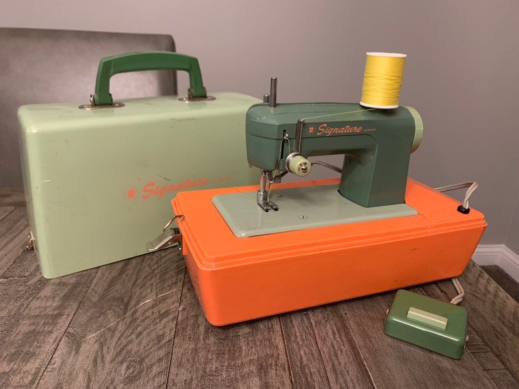 The next great treasure of the day was a 1919 Singer Sewing Machine. Whenever I find a vintage machine I love thinking about all the outfits or home decor items that had been sewn on it…and all the hours that its former owner would have spent on it stitching those items. Admittedly, this one is in rough shape…but it is still a treasure…having survived for more than 100 years and also surviving the Goodwill Outlet bins. I found the base earlier in the day but didn’t see the machine…so I ended up letting the base go…but I realize in hindsight that I should have grabbed it and put it back if I didn’t find the machine…because I later discovered the top of the wooden traveling case…and then the machine itself.