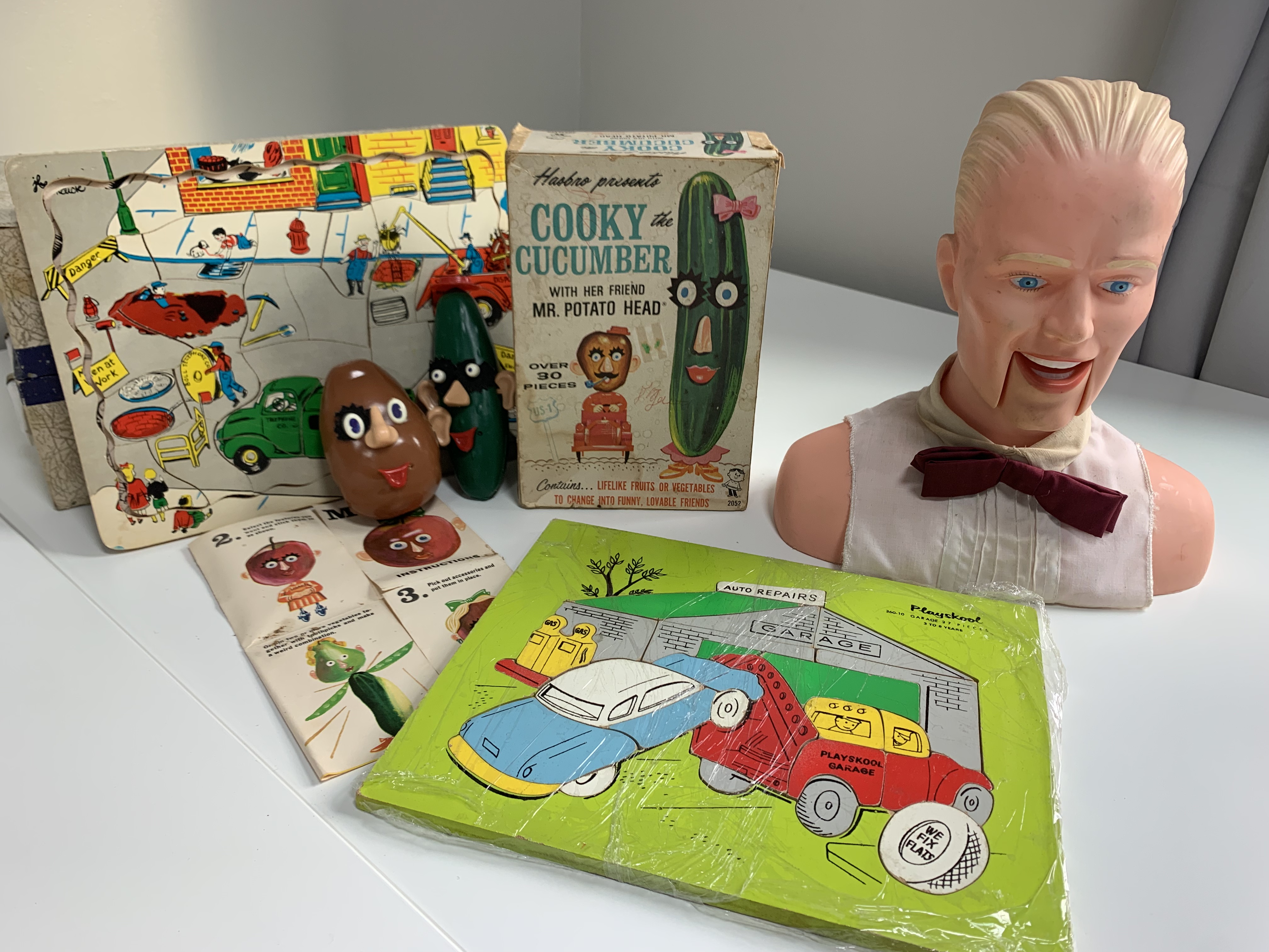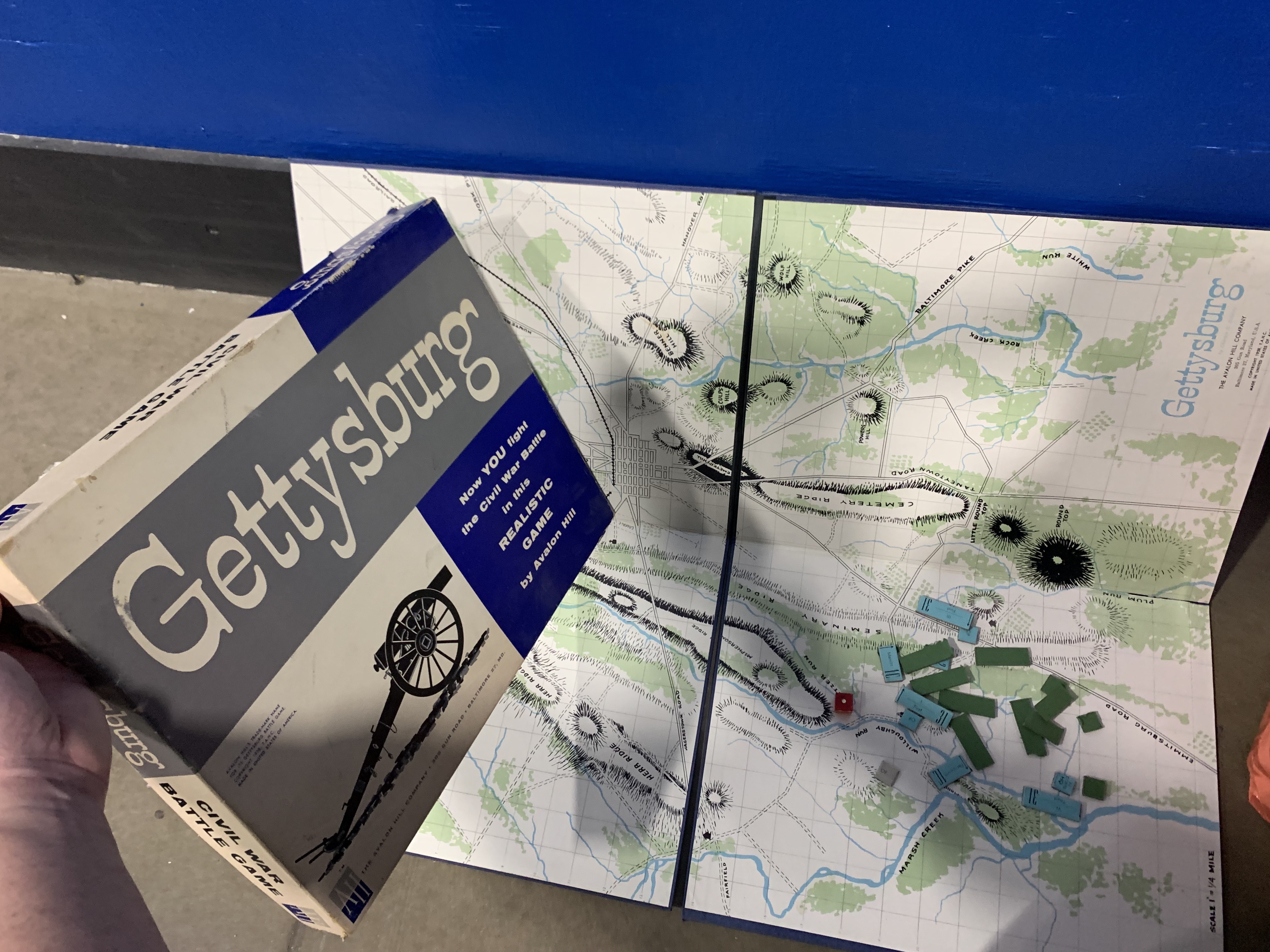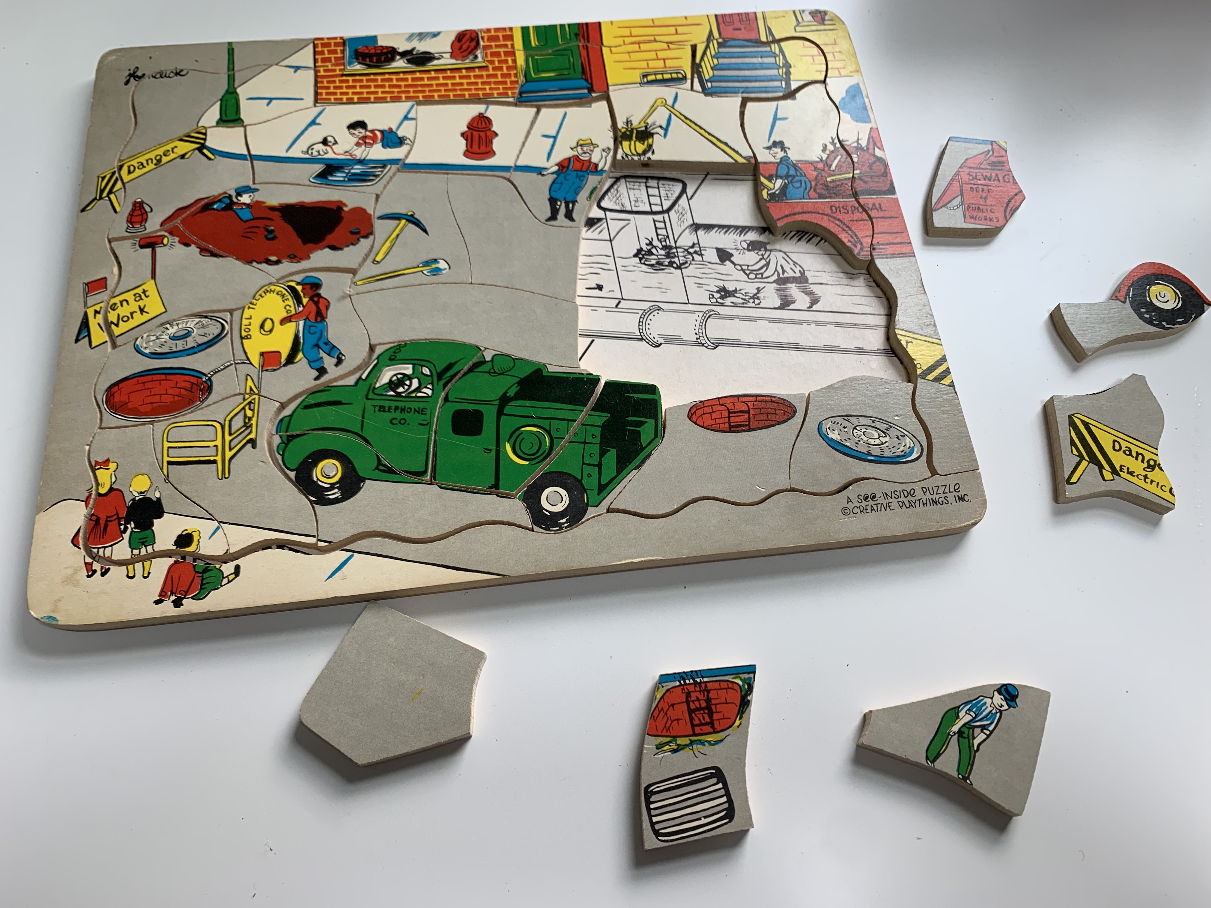 Next up: toys and tins. In the first mini-herd of horses, it turns out one is a mule. Since it appeared to be of a higher quality than the ones I usually find I did a little googling and discovered that it is a Jubilation Bay Pinto Mule manufactured by Breyer. Fun fact: a mule is the product of a male donkey and female horse. I also found lots of fun smaller pieces for crafts. I was really excited to find what I thought was a vintage paint-by-number horse set, but after being bummed out that the box was empty, it later occurred to me that box had been used to house a vintage Meccano engineering set that I’d found a cover and instruction book for nearby. The pieces of the set were scattered throughout the bin and many were quite small so it was a bit of a challenge to recover them, but I was happy with what I ultimately managed to salvage. Rounding out this set of photos are a Swiss army knife, some vintage tins and some unique vintage games.