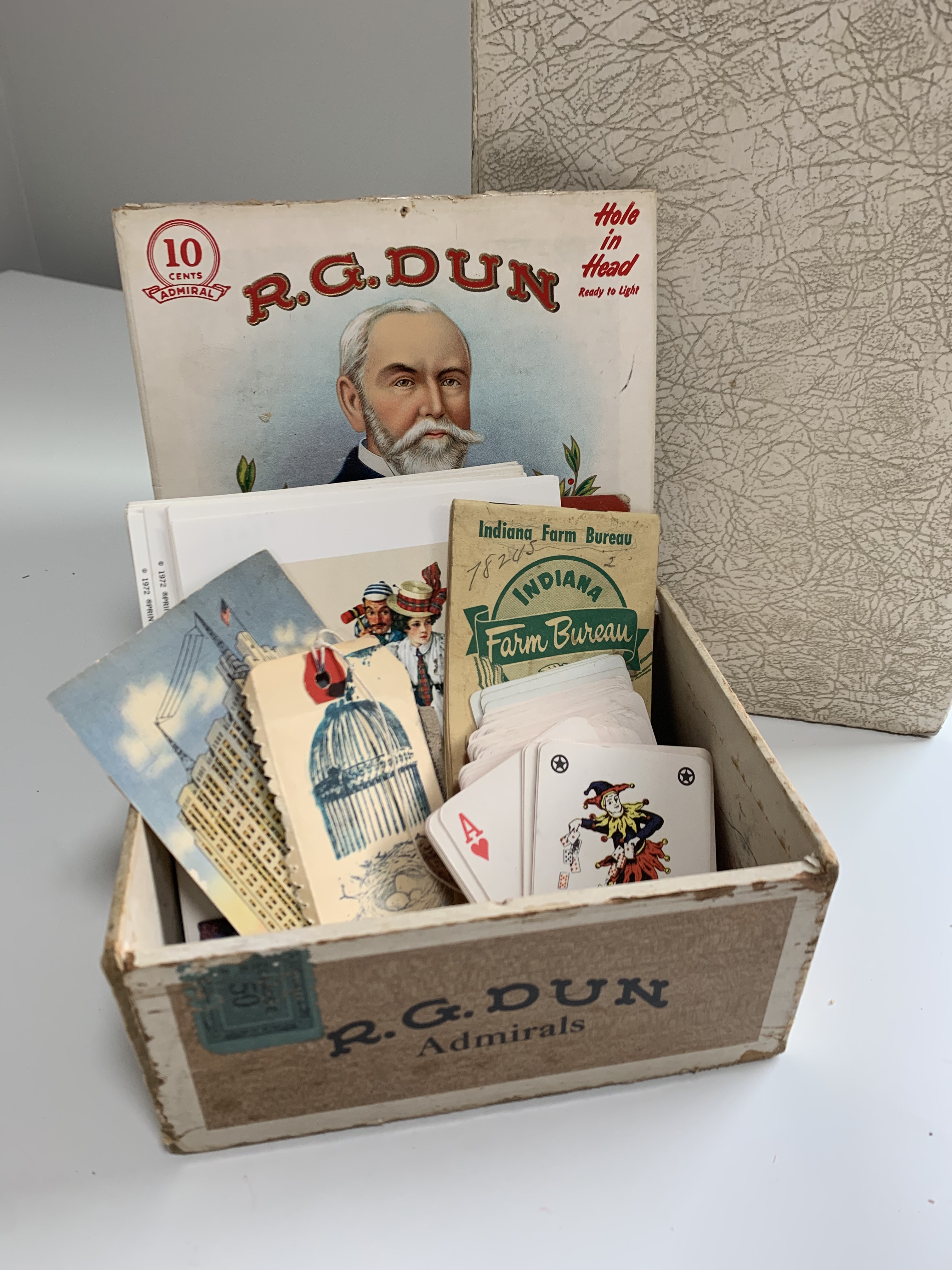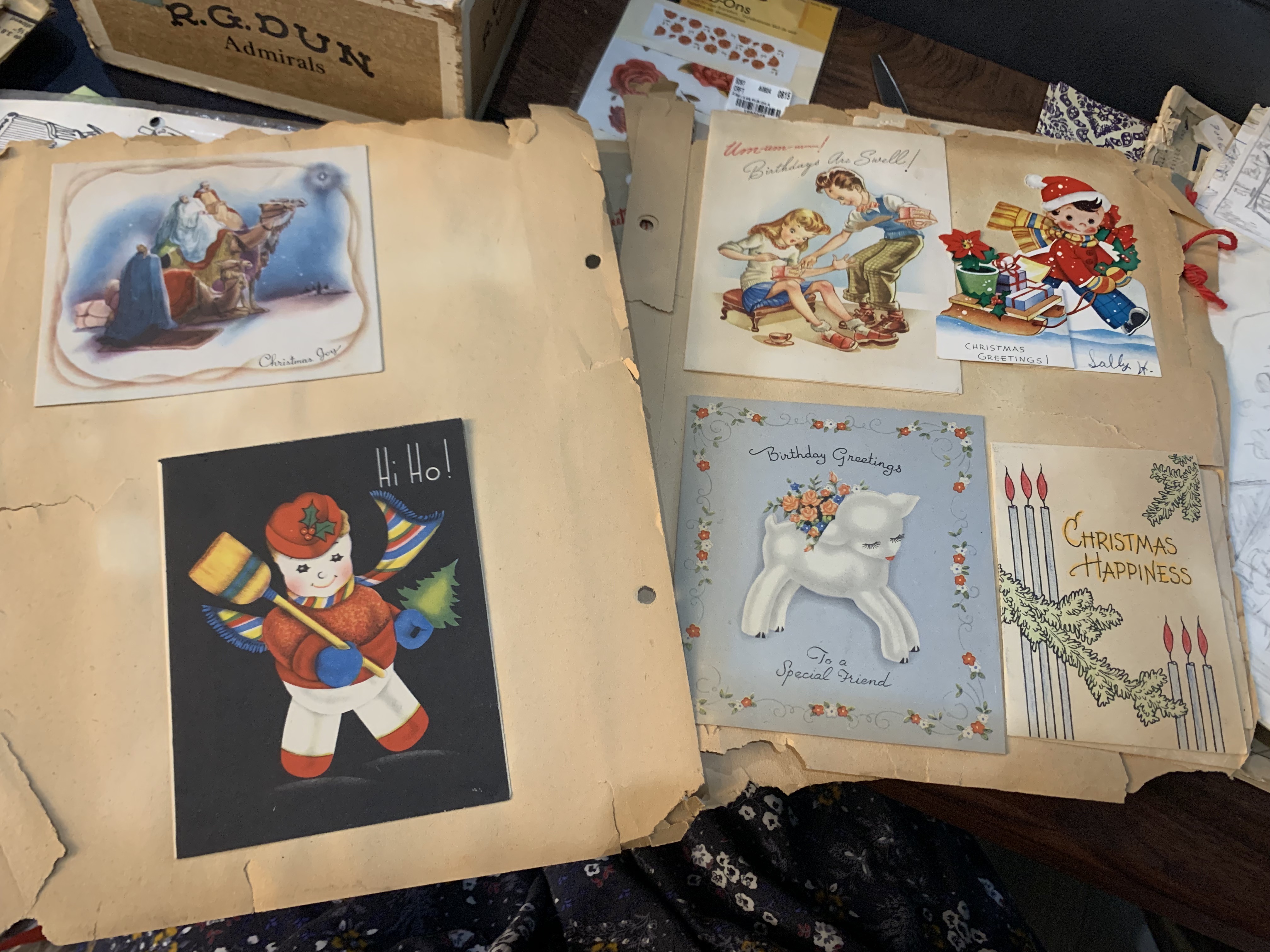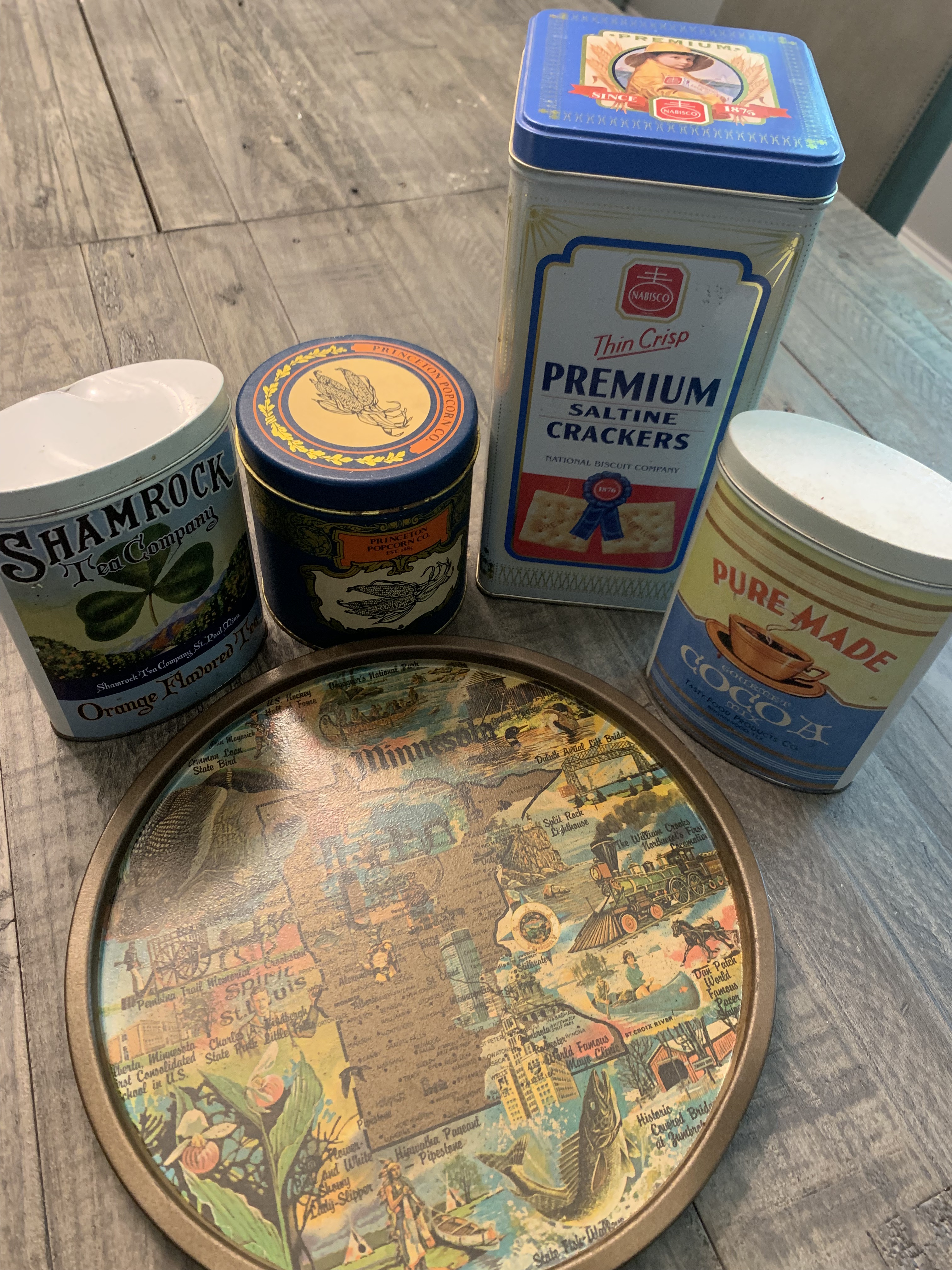 But wait, there’s a little more! I grabbed what I thought was a piece of patterned tin that I could use for a magnet board. It turns out it was made of aluminum but it is still pretty. Fun fact #2: magnets don’t stick to aluminum. I didn’t have a magnet with me on this trip (thus the reason, at least in part, I splurged on the silverware displayed above even though I suspected that most of it was just silverplate). I liked the wire plant holder because it looked a little like baby Yoda…and I’ve been collecting things like that for a she-shed makeover project. The bar in the front of the planter presented another great mystery to be solved. The next two photos show closer-up images. My first guess was that it might be a set of firestarters that could be broken off. I’d seen another small piece of a similar block that had been broken off of the larger block that it had apparently come from, but I didn’t buy it – that one appeared to be made of what looked to be plywood. I reached out to my friend Echo who is a native Chinese speaker and asked if she could help me figure out its origins. She was equally intrigued to learn that it was a brick of tea, and delighted to learn that the Zhao Liqiao Tea Brick Factory that made it is in Hubei Province where her grandfather was born –and that there had been a longstanding tea trade route between Hankou and Russia. She also helped me learn that a similar object is in the collection of the Museum of Applied Arts and Sciences in Australia (https://collection.maas.museum/object/363008) and that older bricks are prized by collectors. We ultimately suspect that this is a more modern one, sold as a souvenir – but it was definitely worthwhile to discover all this cool history. I also found three great Vera Bradley pieces, a fun vintage dinner tray adorned with oak leaves (note: I found the black one on this trip, but was delighted that it was a close match to one that I’d purchased at an antique store several years ago). I also found some cute girl scout things and neat old fan. Thankfully it weighed more than 15 lbs, which is usually a bad thing when you are paying by the pound, but that is the threshold at which they are willing to do individual pricing. I got this vintage beauty (likely made sometime in the early 50’s) for $7. I added some Christmas cards to it for inspiration on how an old fan like this might be used for decorative purposes.