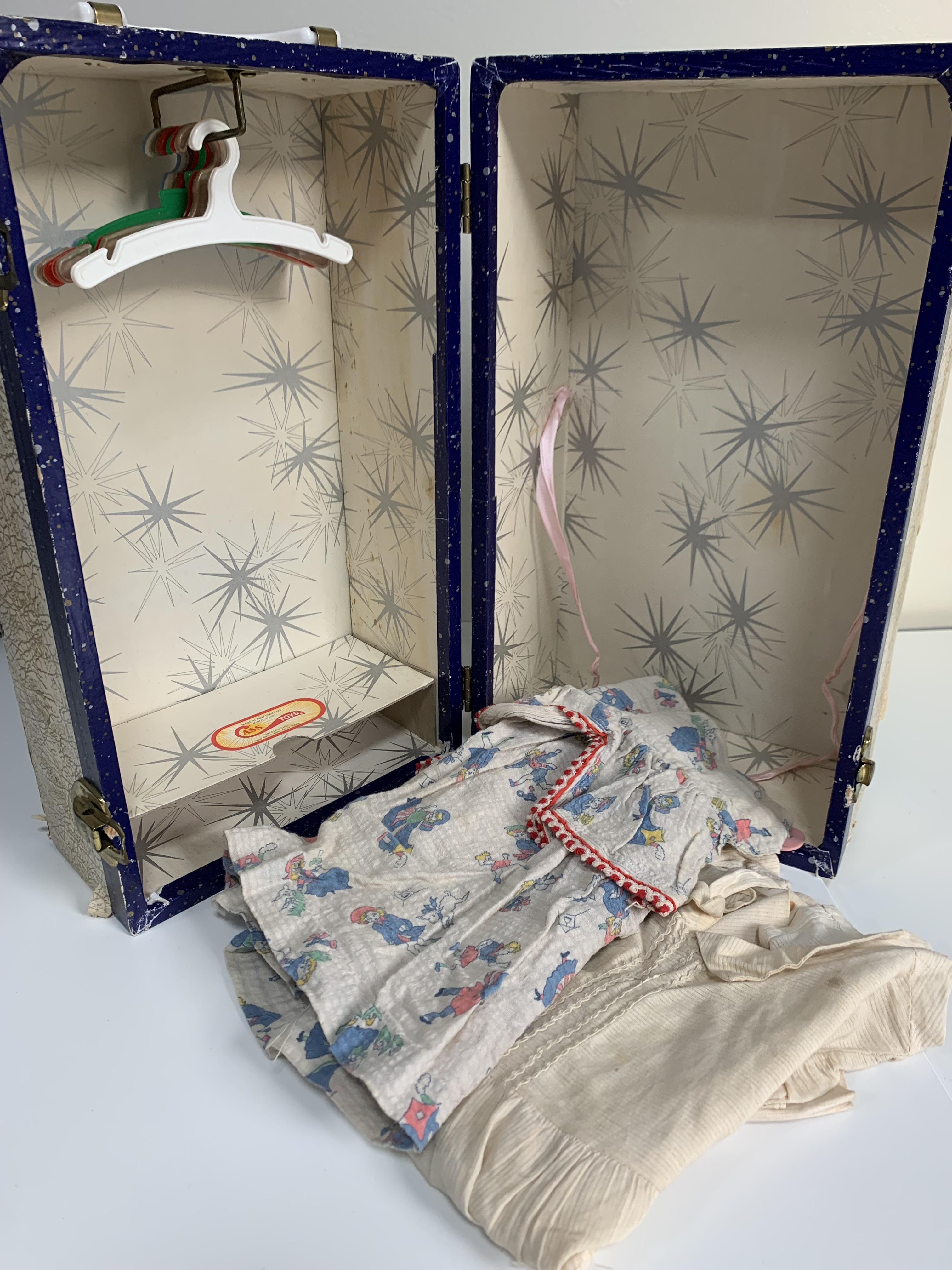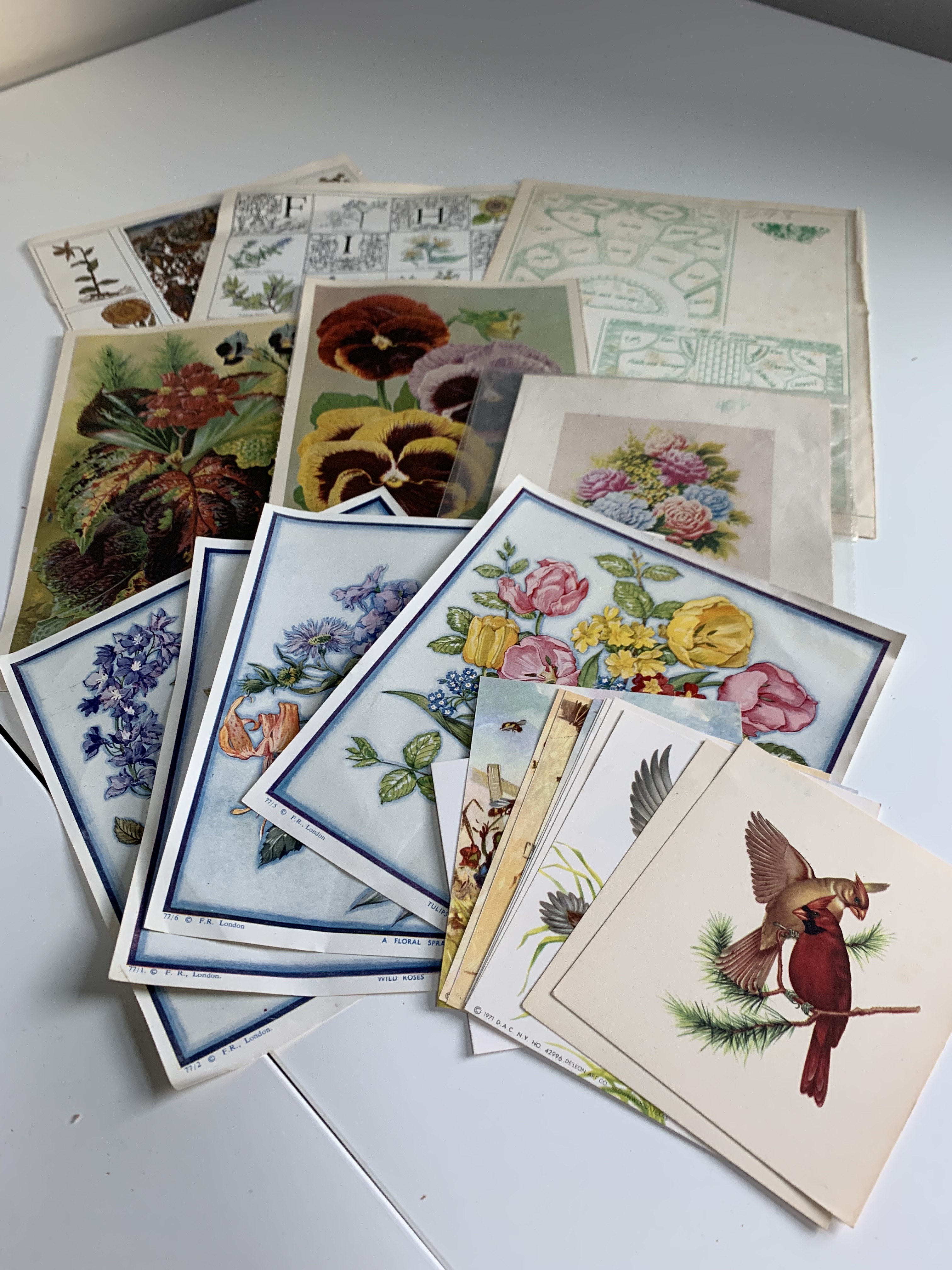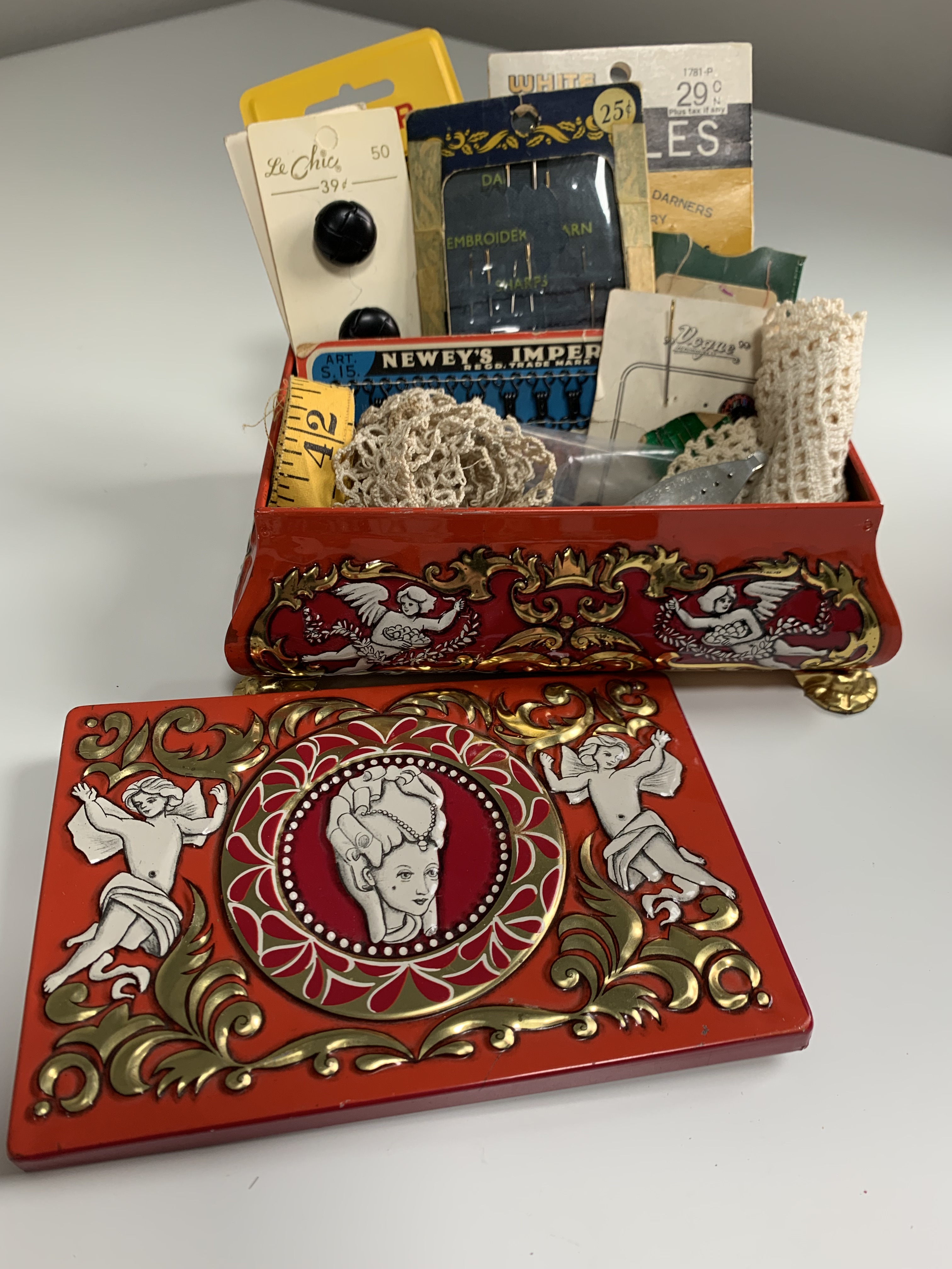 A good thrifting haul wouldn’t be complete without some holiday decor and vintage sewing or craft supplies and this trip was no exception. I grabbed the tin treasure chest to hold some of the sewing things I’d found. I like tins, but usually stick with the kind that have tops that come entirely off because they are easier to use for crafts and garden projects. It turns out this particular tin was a treasure in its own right. I found a similar pattern (but different style) on this site that suggests it was from around 1910, and I found a similar style of chest from what seems to be the same brand here but it can’t be too terribly common if I can’t find an image of it anywhere online. I also found a nice panel of vintage fabric.