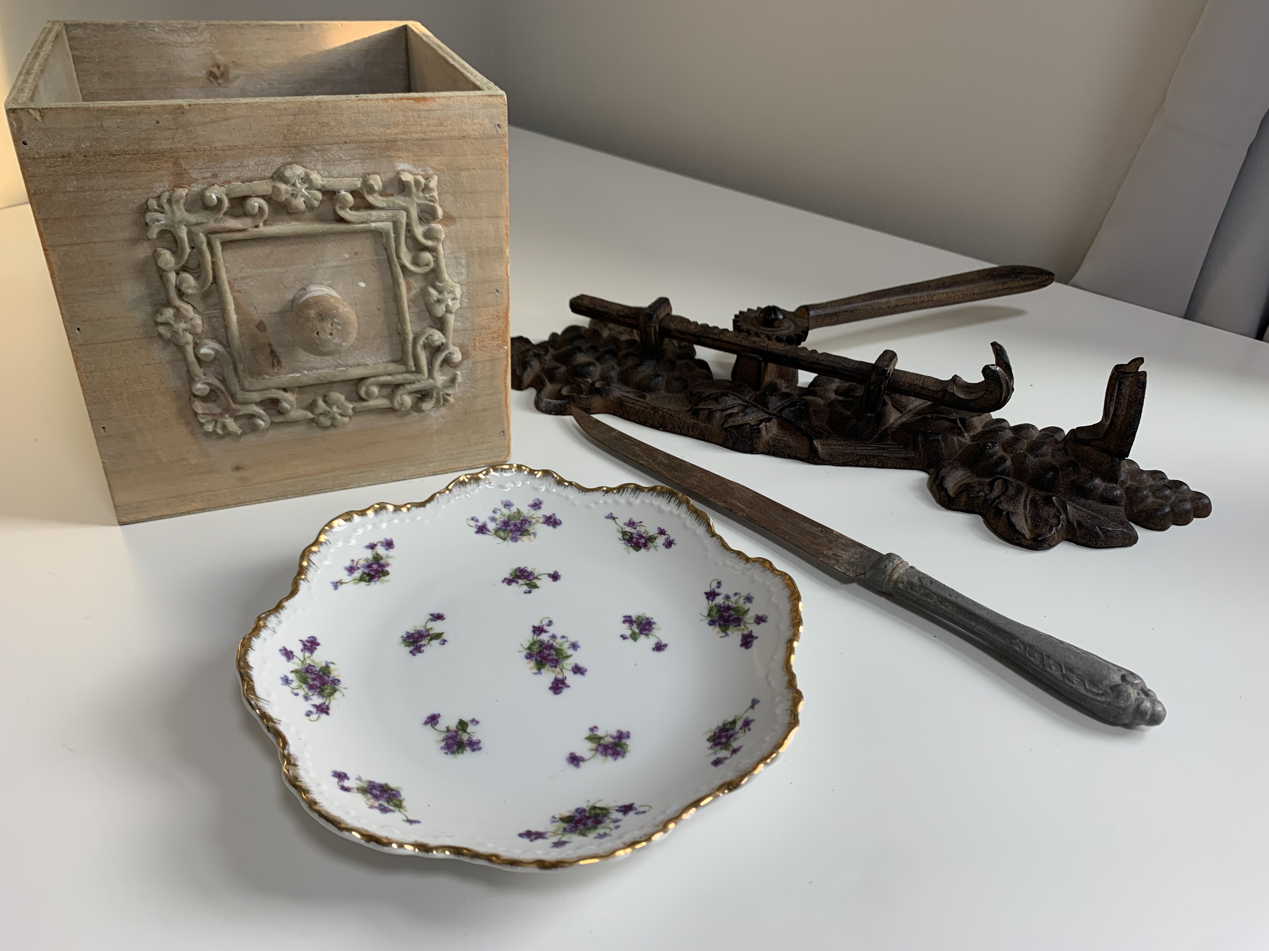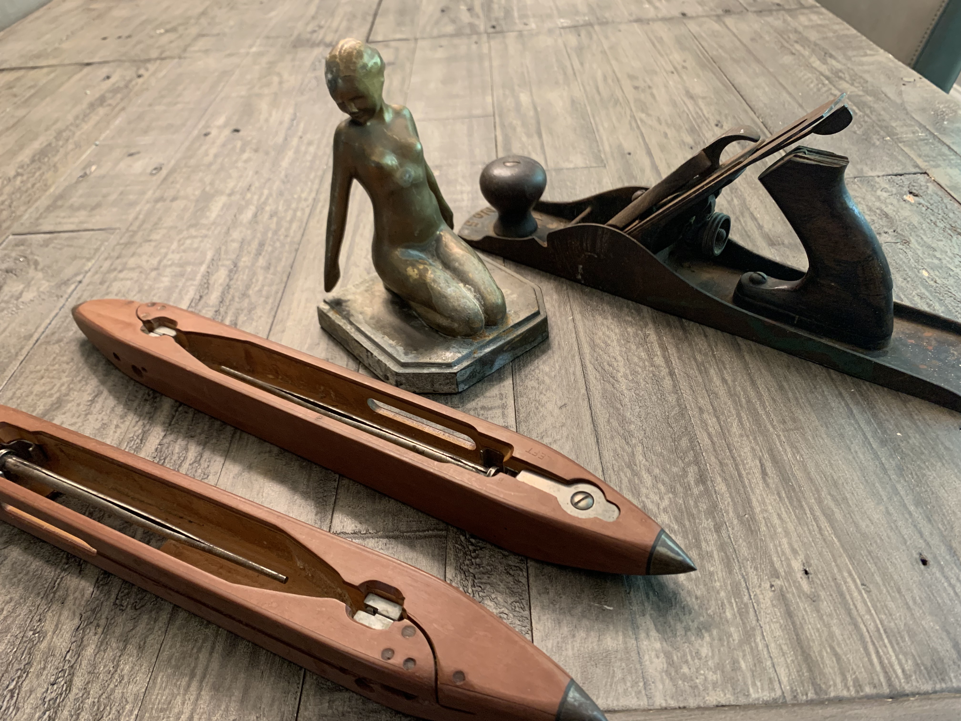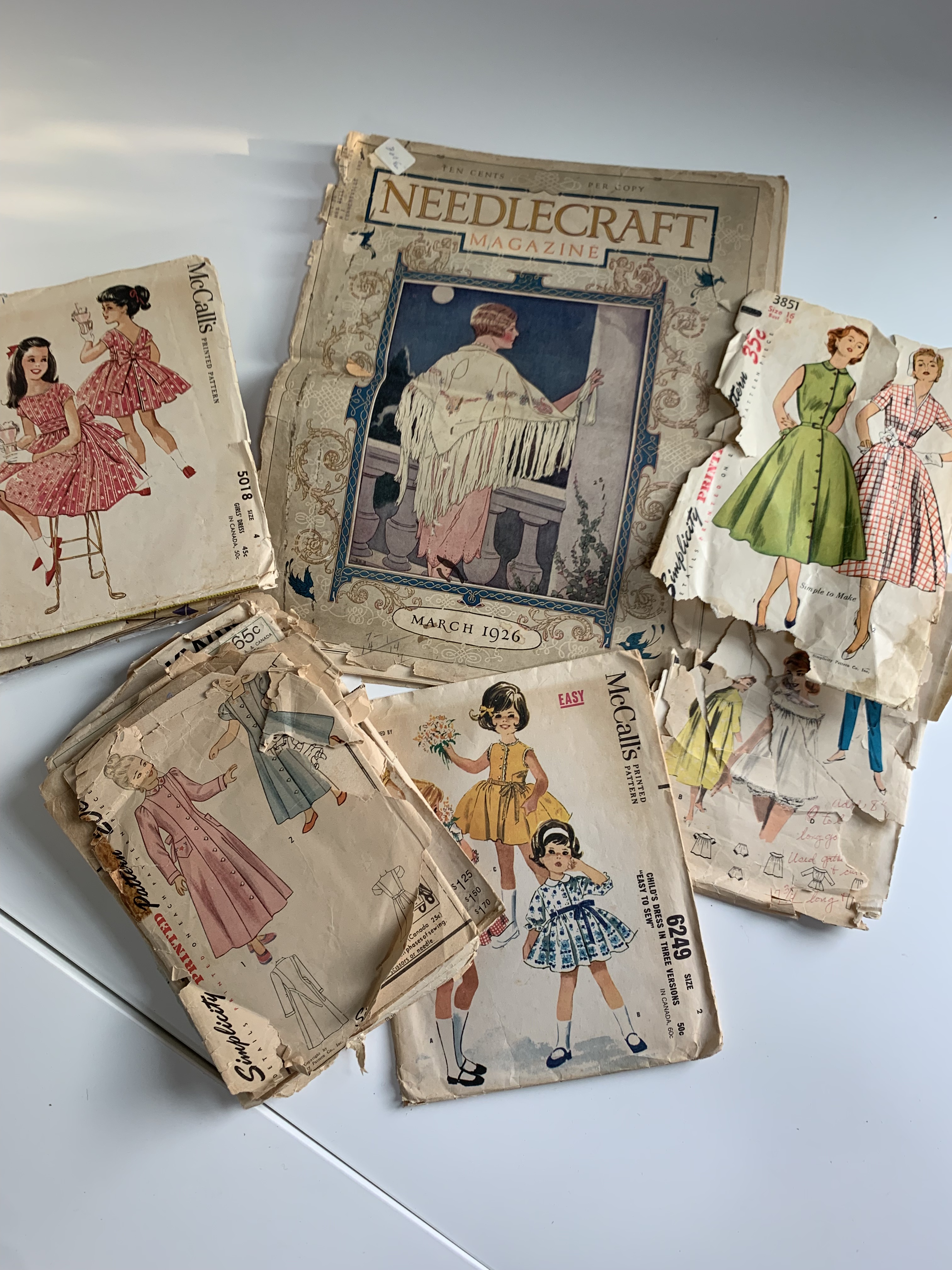 Not bad for a few days of thrifting, eh? Now let’s dive in and take a closer look at some of the treasures I rescued from the bins. The “angel” was a clever craft project that was a little past its prime, but I was more interested in the book that was from the early 1910s. I was thrilled to discover that the pages had been folded (rather than cut). Going through and unfolding each page allowed me to see some of the spots where someone had carefully added notes and discover a few other illustrations that might be fun to use. The book is in rough shape, but will live to see another life, perhaps as part of new craft projects. I also managed to salvage the styrofoam sphere used for the head and part of the handmade doily that had been glued on as a collar. Below the angel, you’ll see a new Redmon basket (and a new-to-me pattern to add to my growing collection – as displayed at: https://jenni929.wixsite.com/redmon)…when I found that within minutes after arriving at my first stop on the second day of shopping, I knew an epic day was in store – and to think that sweet basket had not only survived the bins, but also lasted through an entire rotation before finding its way to my cart! I was also excited to find a plaid bag. When I had it my cart, someone pointed out that it was too bad that it was missing the thermos. That clued me in to the fact that it might be part of a set…but it turns out that I already owned the matching thermos (sadly sans cap). Next up: a cute little ceramic planter that I look forward to populating with some greenery soon. And lastly, in this block of goodies, lots of silver plated treasures. This was a little bit of a splurge because the pile of silver-plated goodies wasn’t light, but there are some really beautiful patterns in the mix, including some vintage pieces by WM Rogers and good number of Oneida pieces in a Grecian pattern from 1915. There is also an Oneida butter knife in the Vernon/Ashley pattern (manufactured 1917-1926), a Vernon Silverplate spoon in the Romford pattern from 1939, and a Pike & Madoc knife made in Utica N.Y. (likely no later than 1906, when the company appears to have been sold at auction according to this “House Furnishing Review” book from that year”).