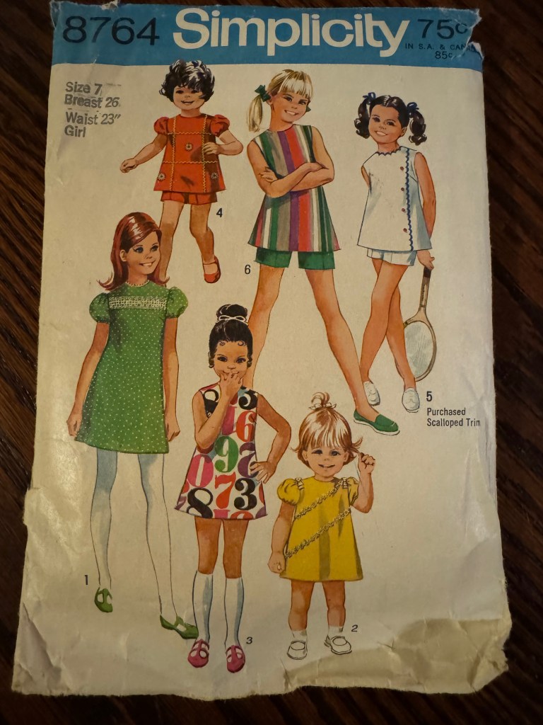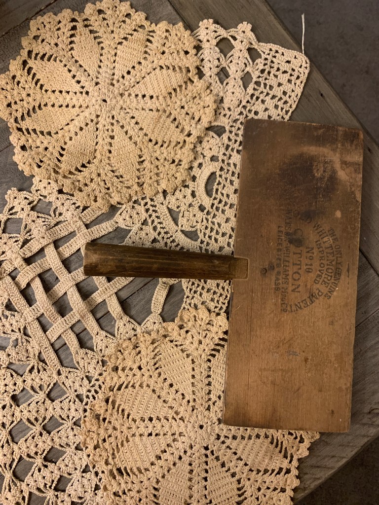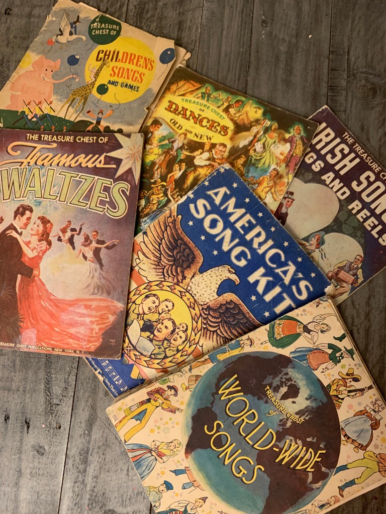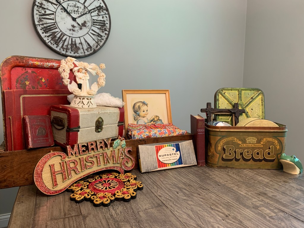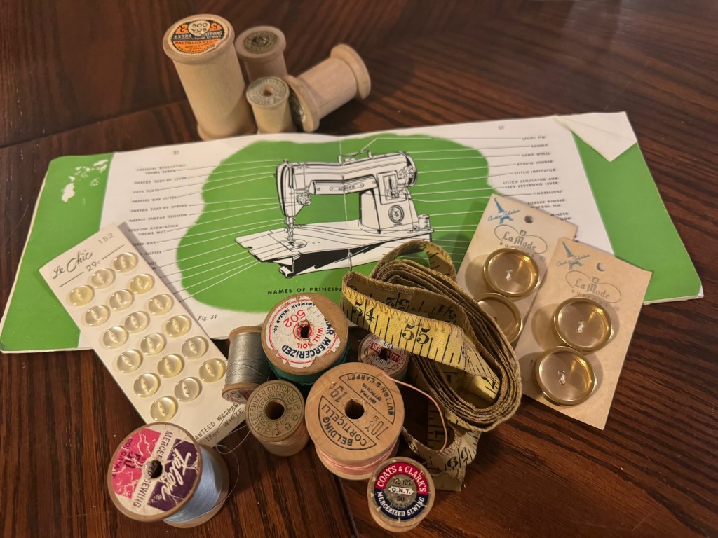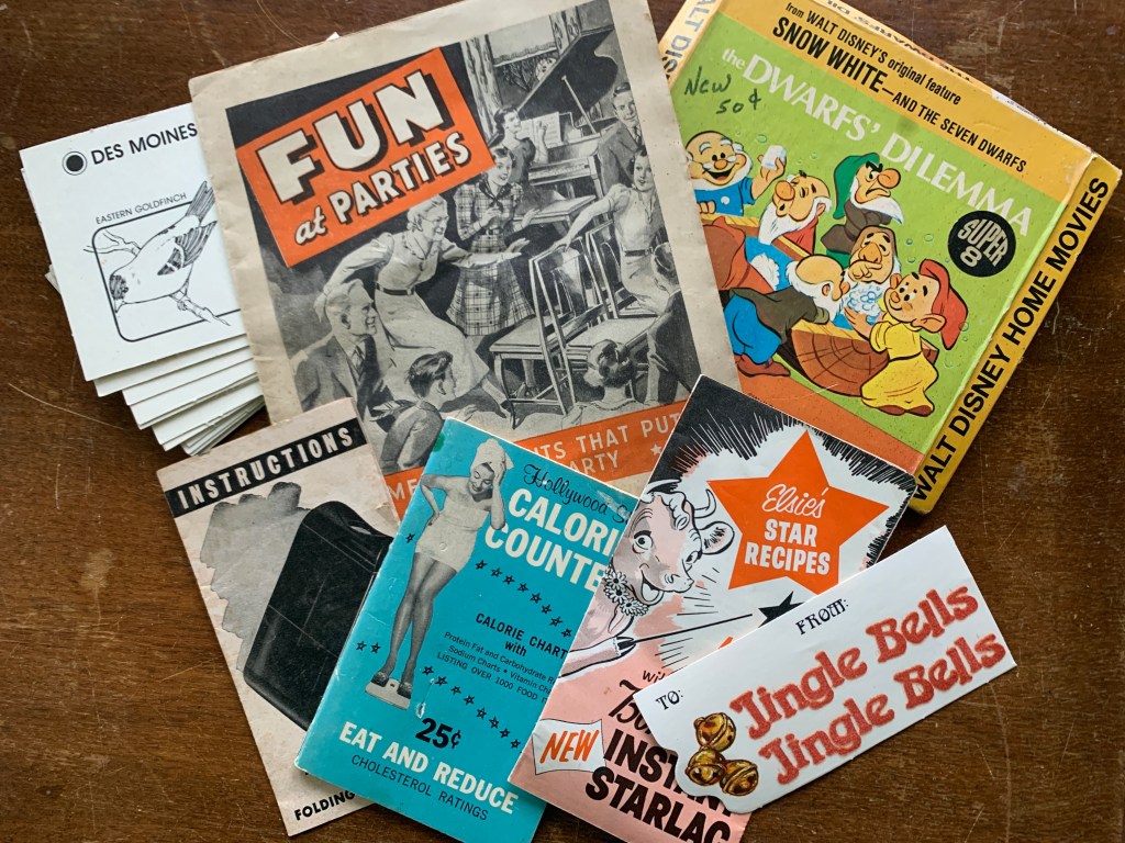 Check out this haul from about four different trips to the Goodwill Outlets in Indy and the Salvation Army in Bloomington (where I found the ceramic rooster planter). Among my most treasured Goodwill finds were a Minnesota Model X Sewing Machine (which seems to have been built around 1912-1913 according to all the great info I found on the Victorian Sweatshop Message Board, some OPA ration tokens from WWII that had apparently been used as bingo markers by the previous owner (I learned more about these from the site: Owlcation), part of a vintage toy car called “Nifty,” some cool metal tins, some Ruth Reeves linen napkins, and a lot of vintage greeting cards and doll clothes patterns, and a life-size Scooby Doo advertising display.