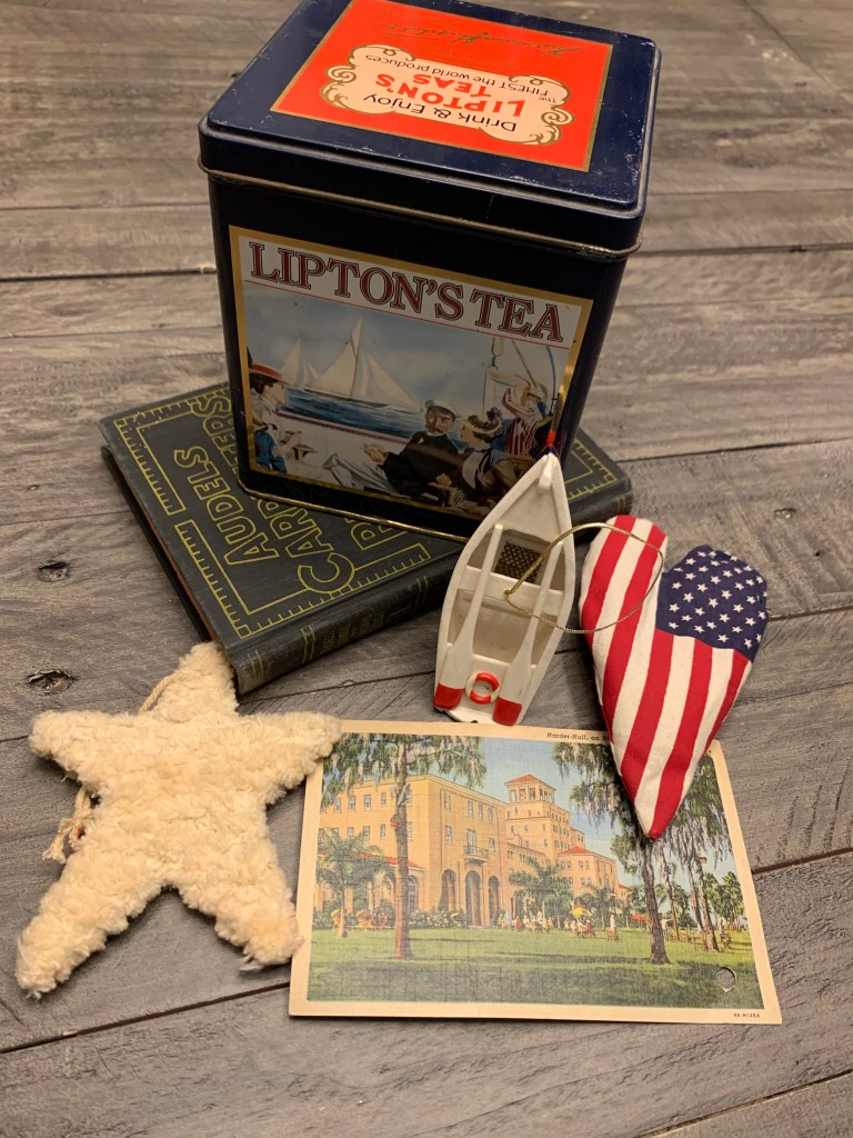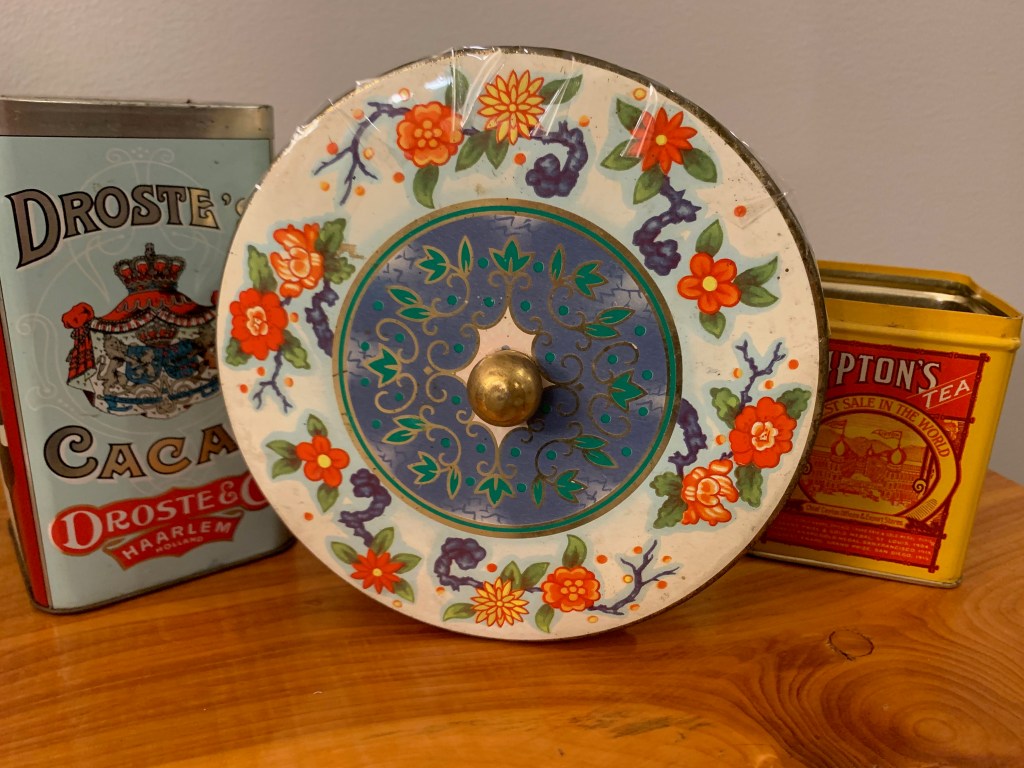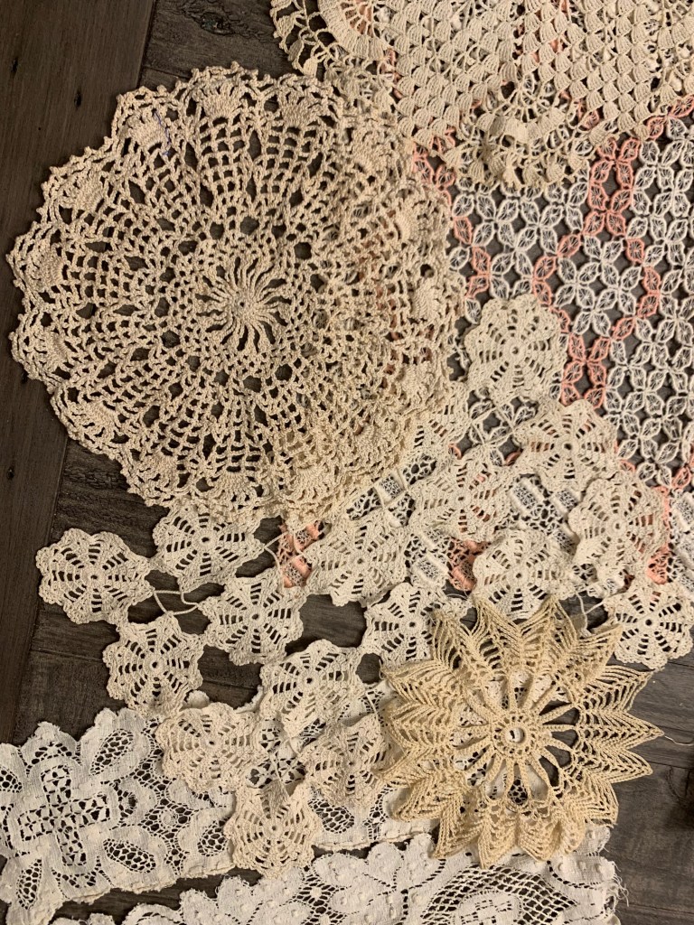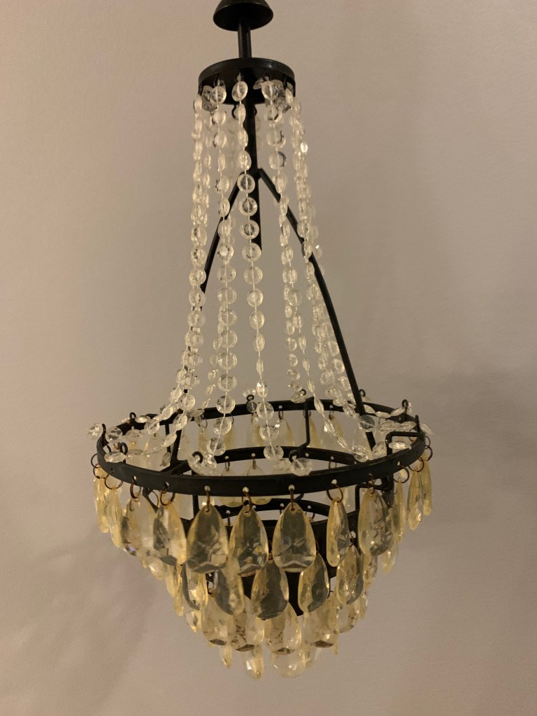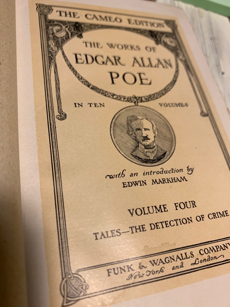 Among my finds were some vintage handiwork, including embroidered objects and doilies, a vintage santa from the late 60s/early 70s that apparently sings and dances, a set of retro tea cups in pastel, a few Shiny Brite ornaments, various pieces of ephemera, a cool looking old doll and doll-head, some fun vintage tins, a chandelier which I’m planning to put in my shed and an Edgar Allan Poe book from 1904 – not a first edition but well over 100 years old!