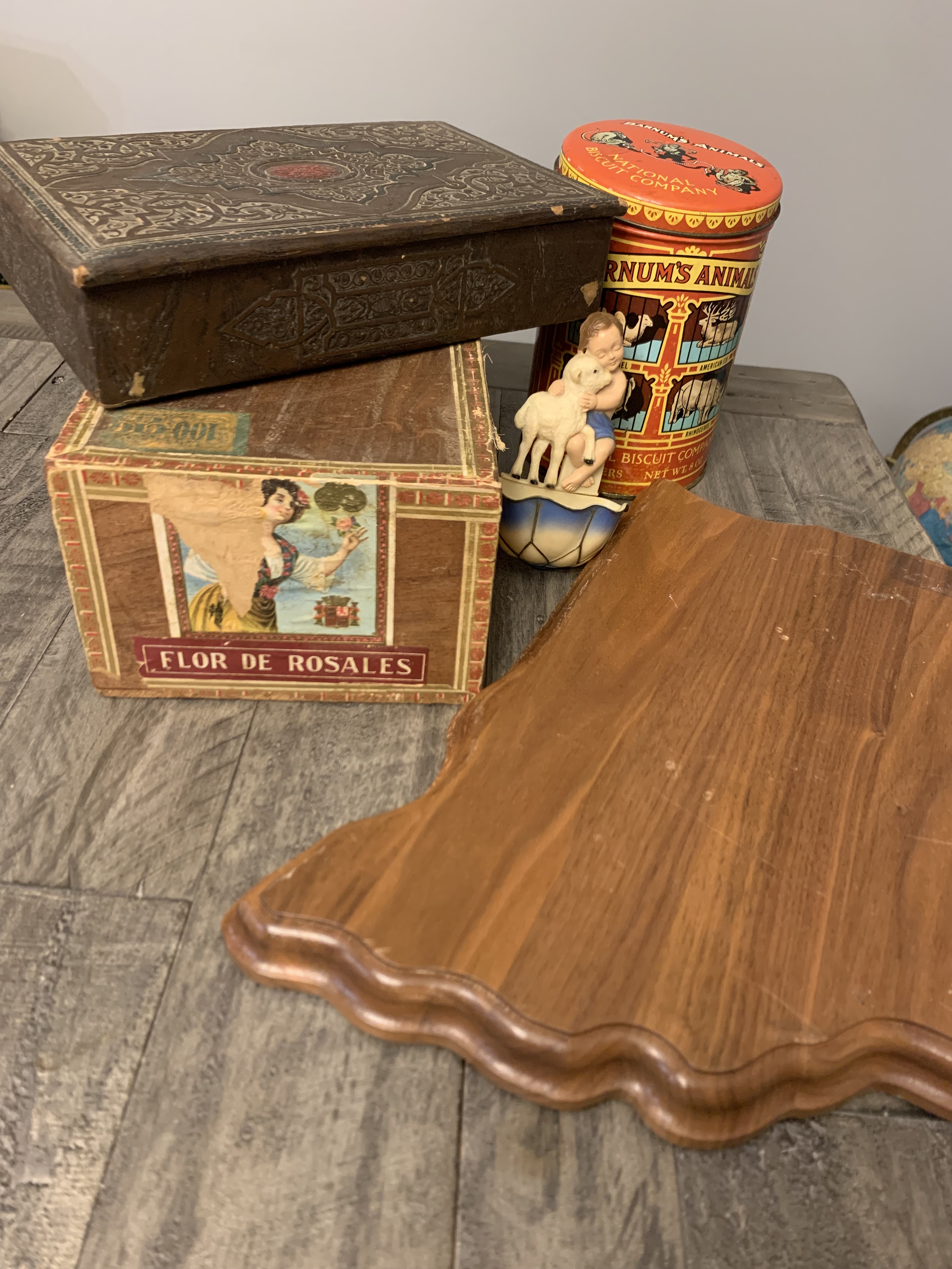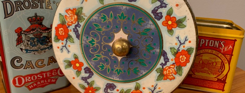 Okay, that was my lame attempt at a play on the “April showers bring May flowers” saying…since this post shows a combination of thrifted finds from April and May. Highlights in this batch include: a retro tiki tin, a cool vintage game board for a game called “World Flyers”, vintage children’s books, early Elvis records, some vintage linens and some fun decor for Halloween and some awesome vintage Christmas finds.