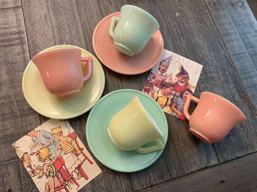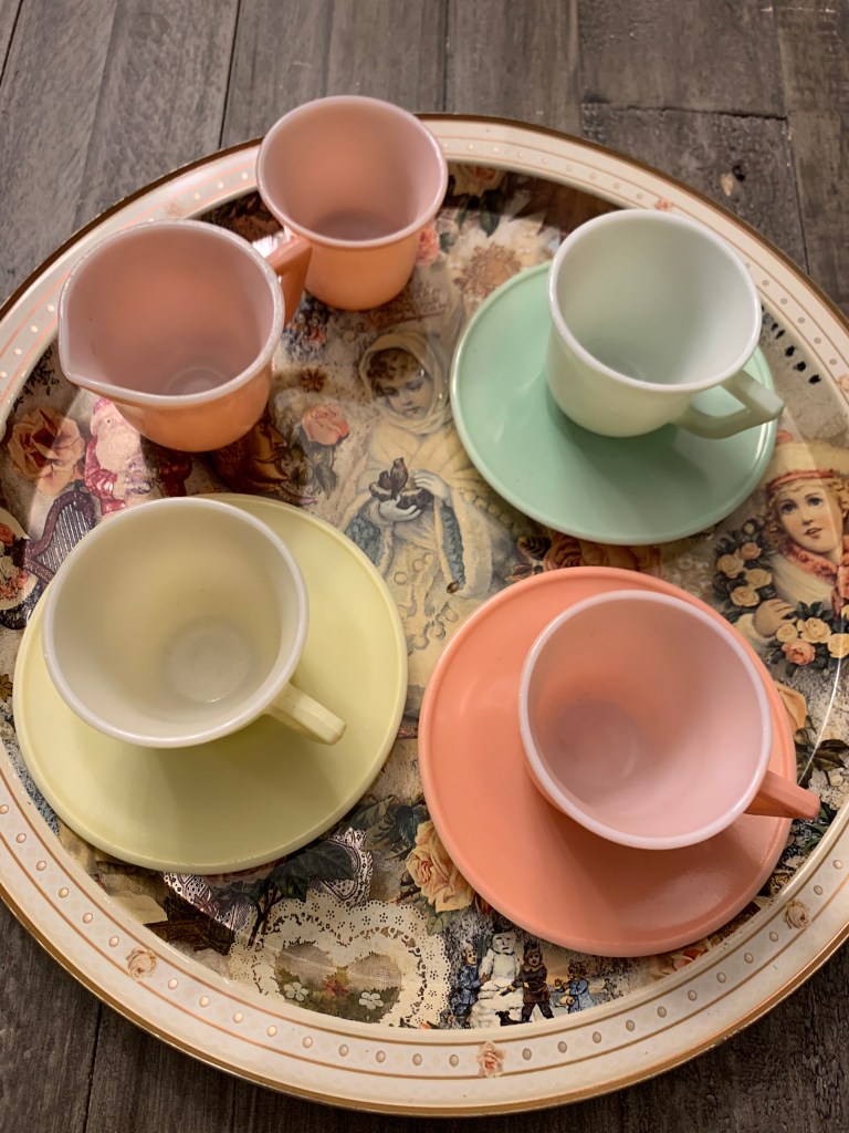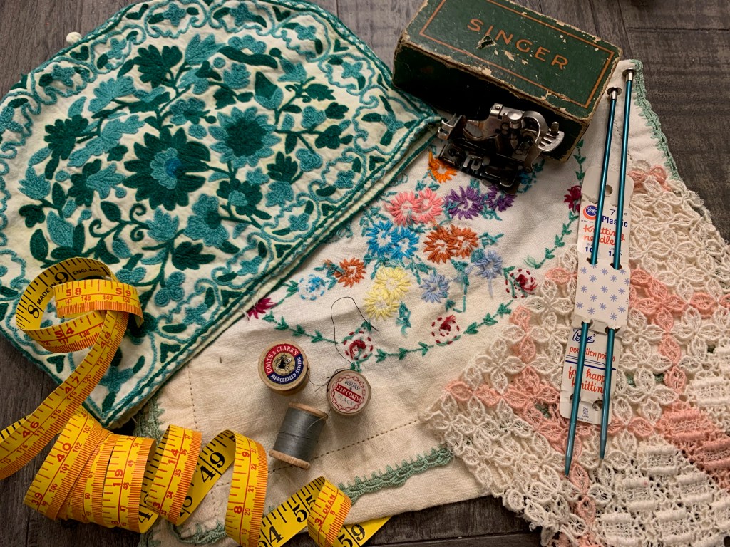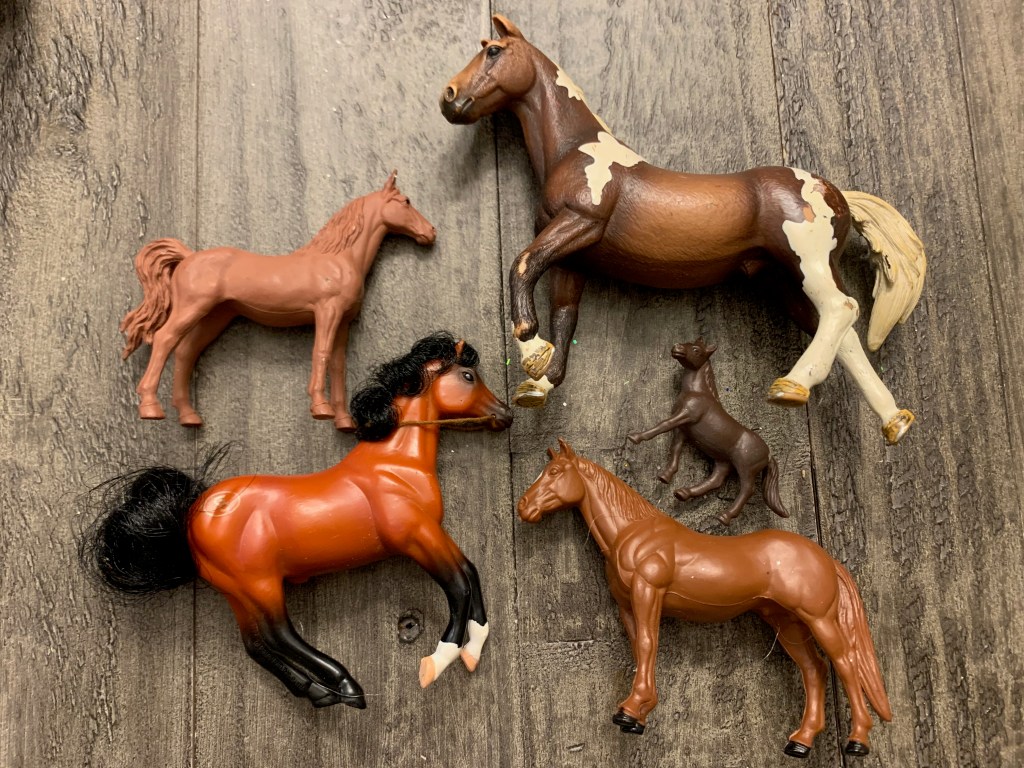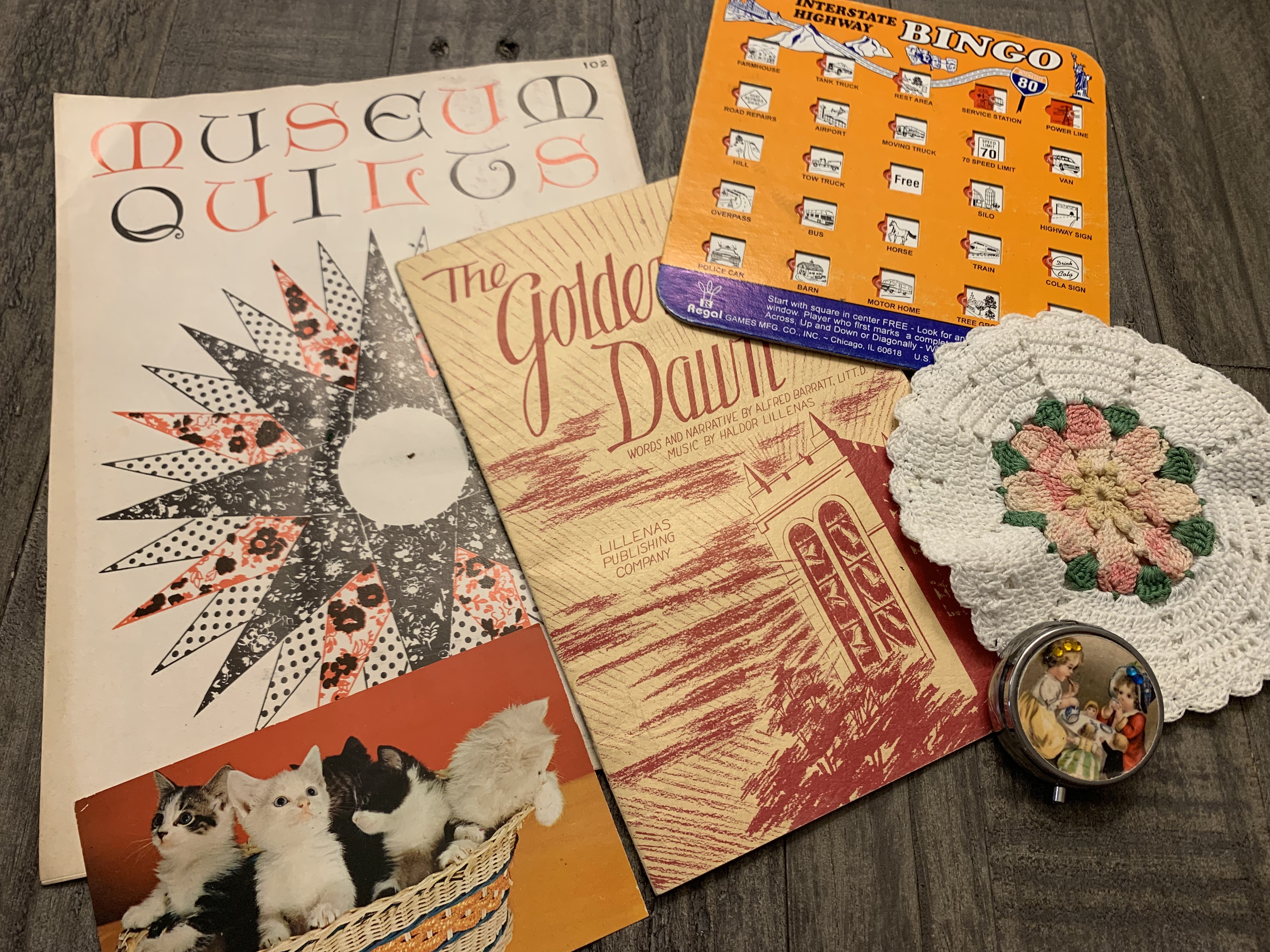 On my “always on the lookout” list are toy horses for crafts and display (I usually try to steer clear of ones with hair and stick to ones in good condition that are all plastic), vintage sewing stuff (wooden spools of thread, notions, tape measures, etc.), vintage holiday decor (esp. vintage Christmas), paperdolls, Redmon baskets, dollhouse goodies, tea cups, globes, puzzles (old and new), vintage toys and games, old racquets, wooden rulers and cool old frames. I’m sure that’s not an exhaustive list, it is always evolving. I probably need to make bingo cards…but even without the cards, I feel like I’ve “won” a day of thrifting when I find a few things from this “favorite things” list.