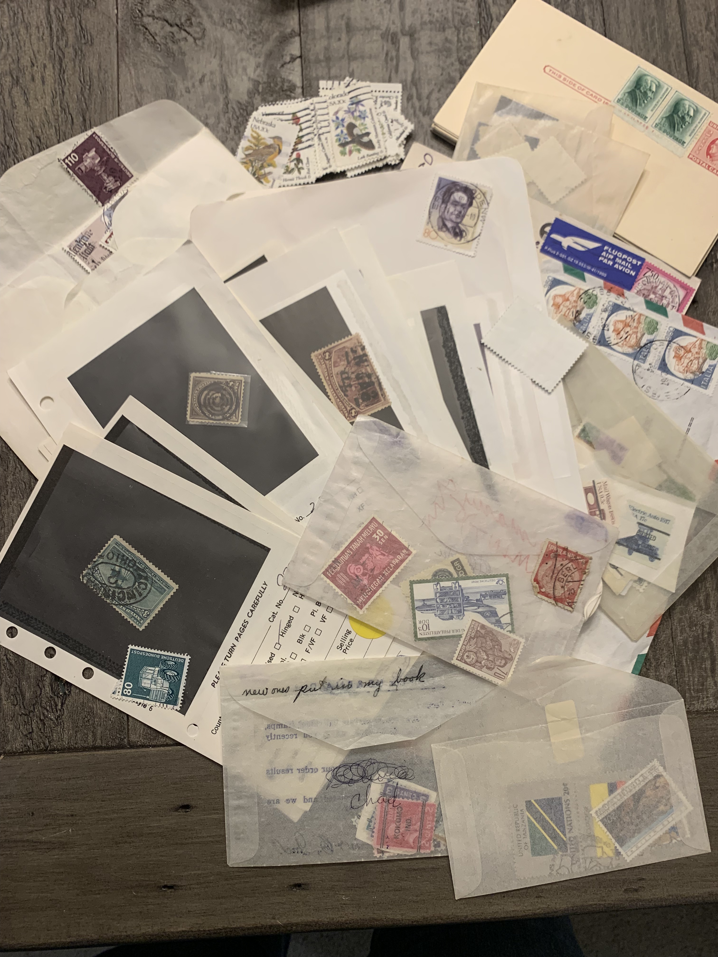 I hit two Goodwill Outlet…including one with the entire thrifty sisters crew! The vintage Santa doll looks a little shifty, but the best find of the night was a stamp collection. We’ve been having fun looking up info and values for some of the different stamps…the collection includes stamps from the 1890s through the 1980s. They grabbed my eye initially because I thought I could use them for crafts…but it seems like there might be some that are far too valuable to add to a collage.